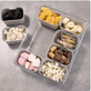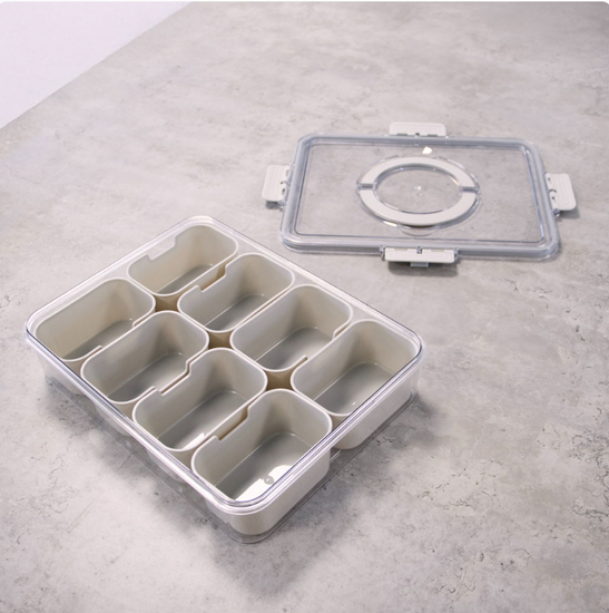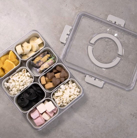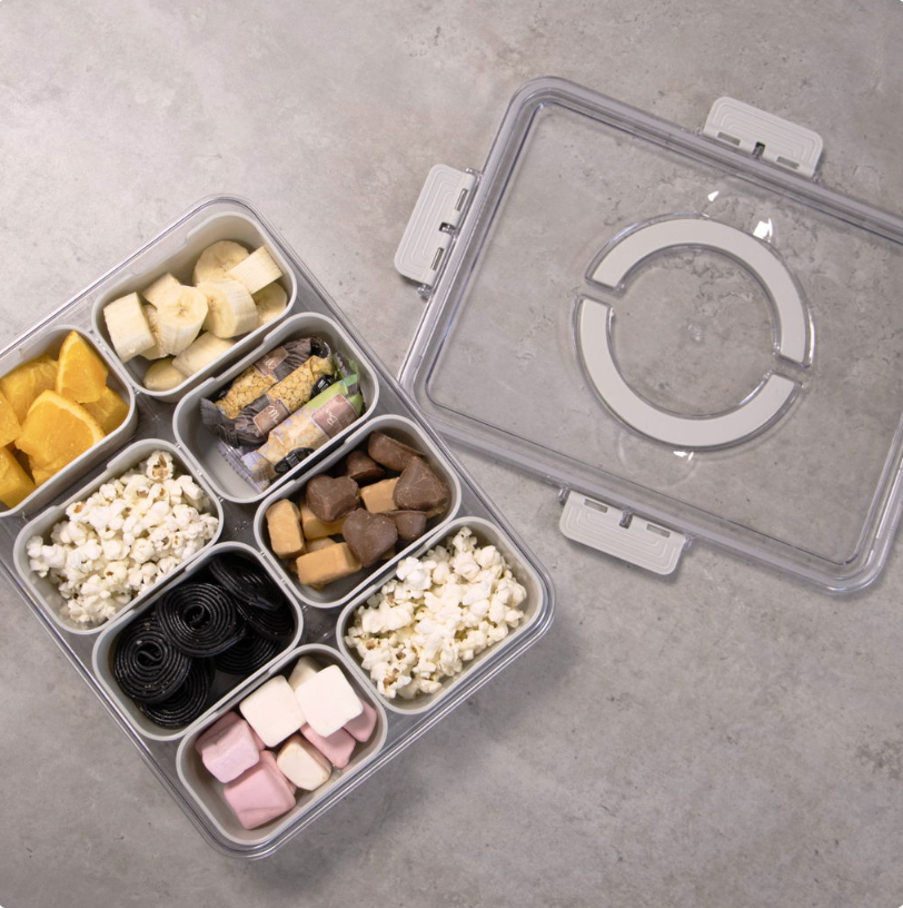 - Oppbevaringsboksen har åtte separate rom for enkel organisering av mat og snacks