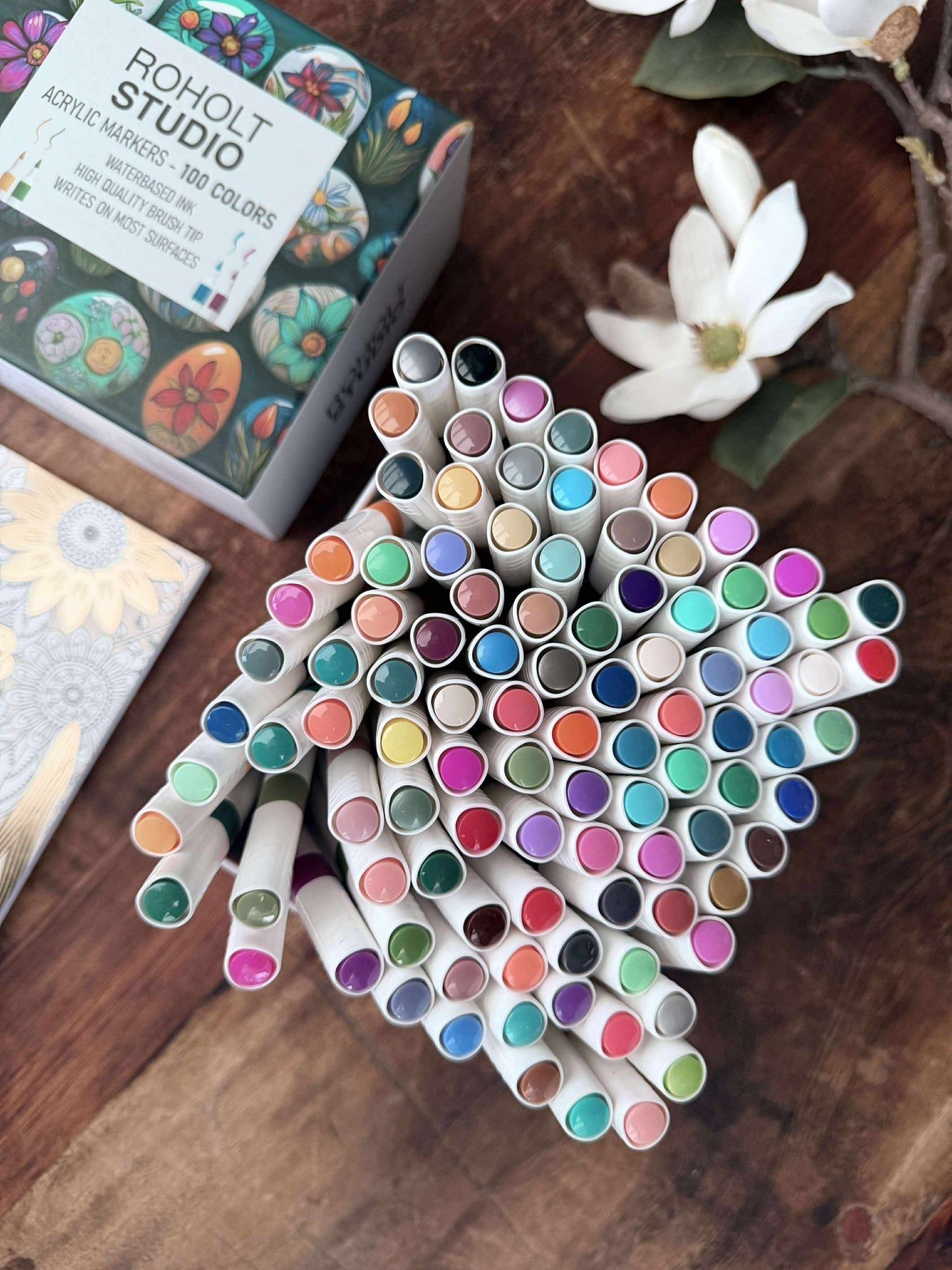 - Settet med akryltusjer inneholder 100 forskjellige farger, inkludert klare, dempede og nøytrale toner