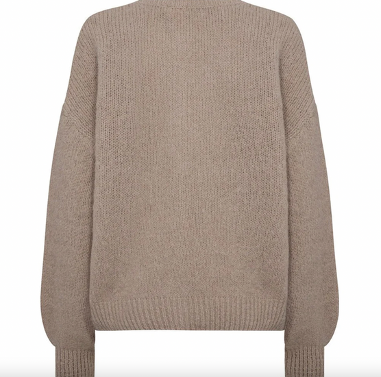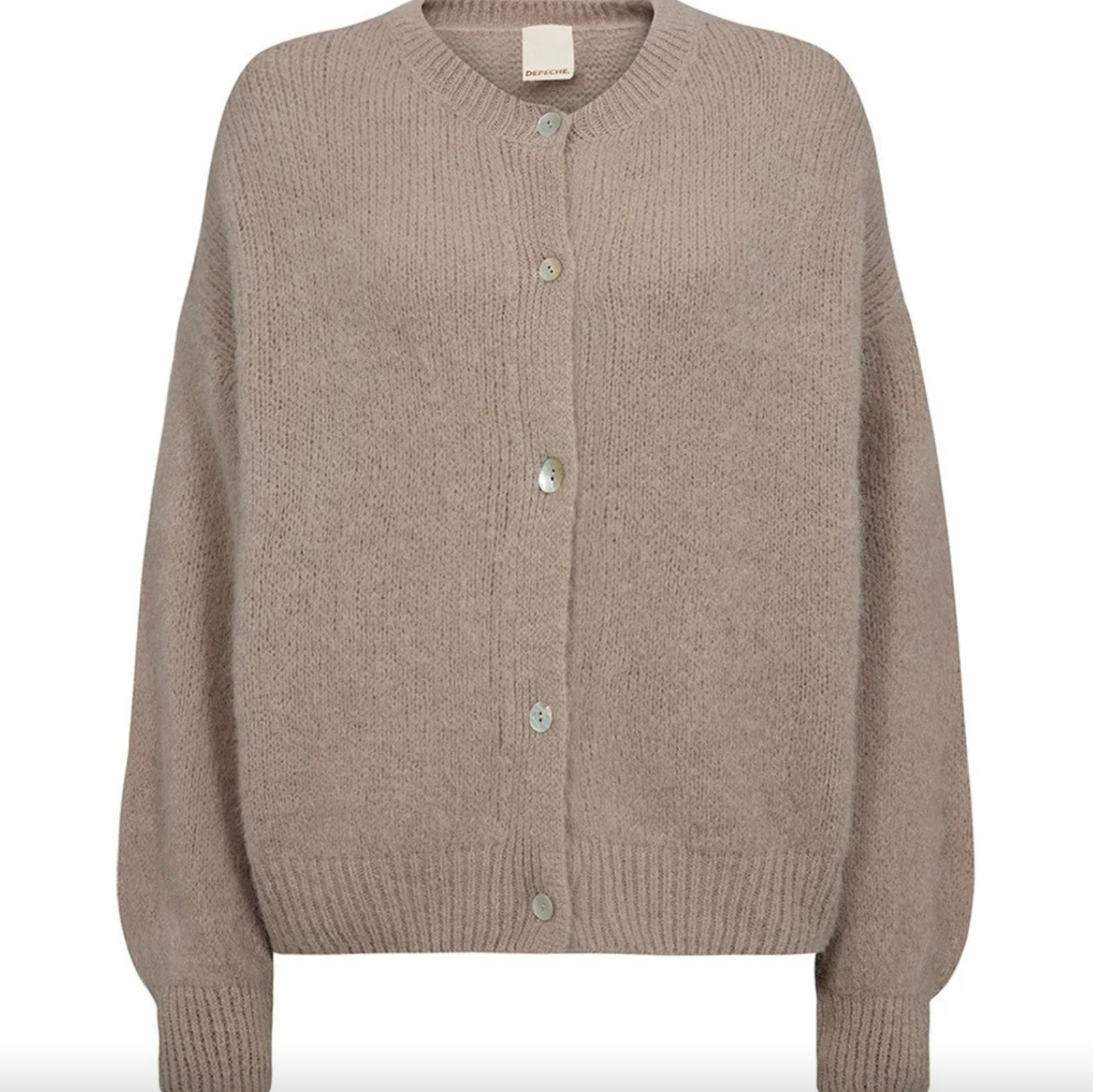 Alpaca-cardigan Depeche i sand kombinerer et enkelt, feminint snitt med en myk strikk og fine detaljer. Cardiganen er gjennomknappet, slik at den kan styles både lukket som en bluse og åpen som et lett lag. Ballongermene gir et rolig, sofistikert uttrykk, som passer like godt til hverdagsjeans som over en kjole.