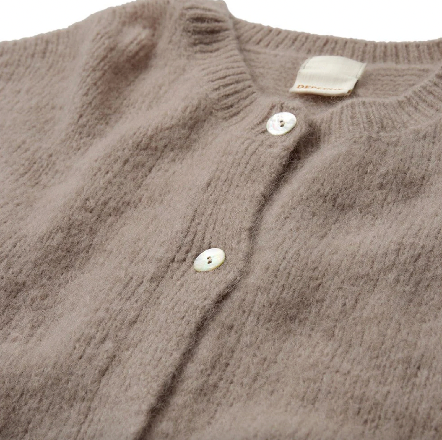 Cardiganen er strikket i en blanding av 38% akryl, 32% polyamid og 30% baby alpaca. Den ensfargede sandtonen og de diskrete perlemorsknappene understreker det elegante uttrykket.