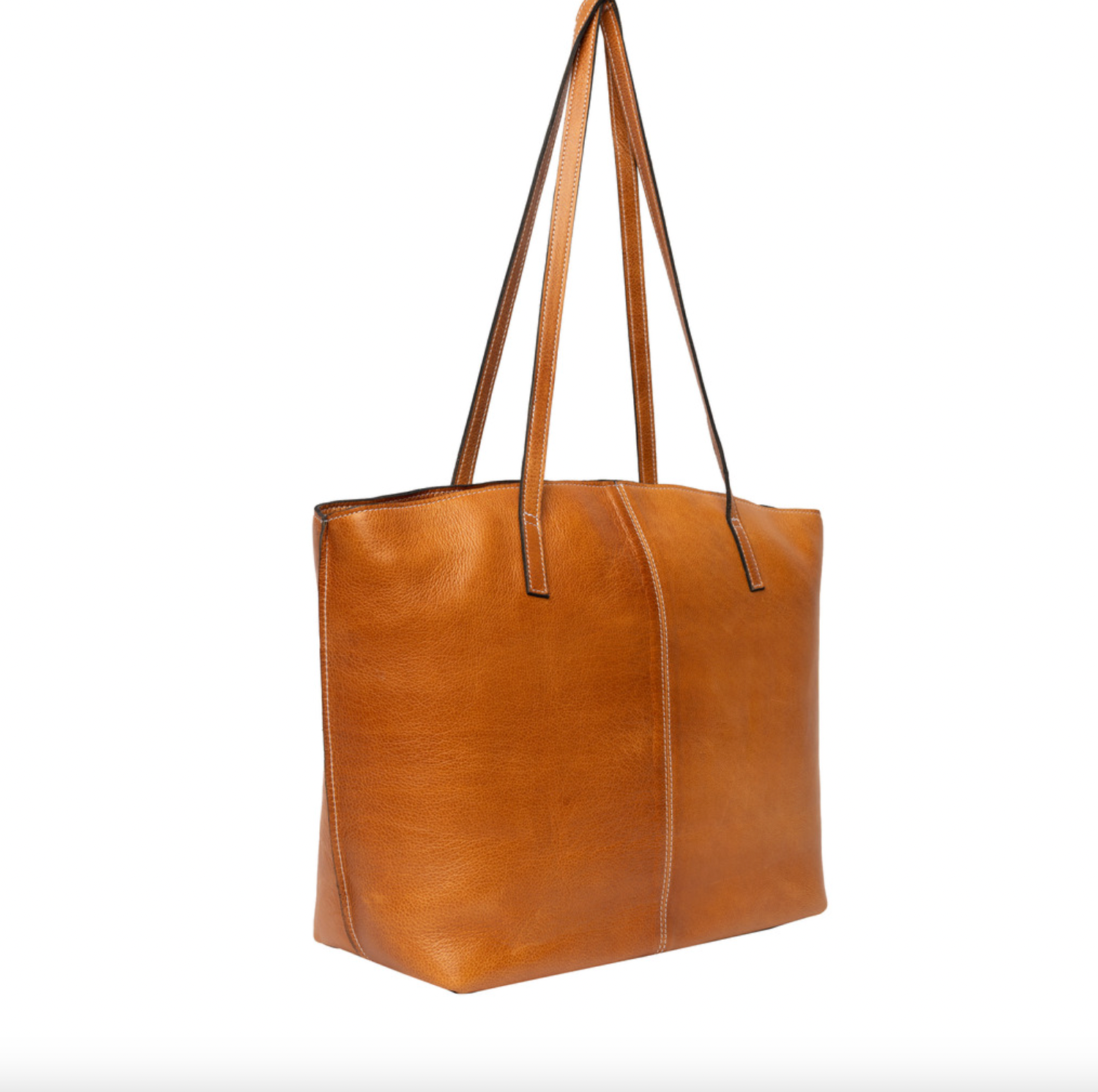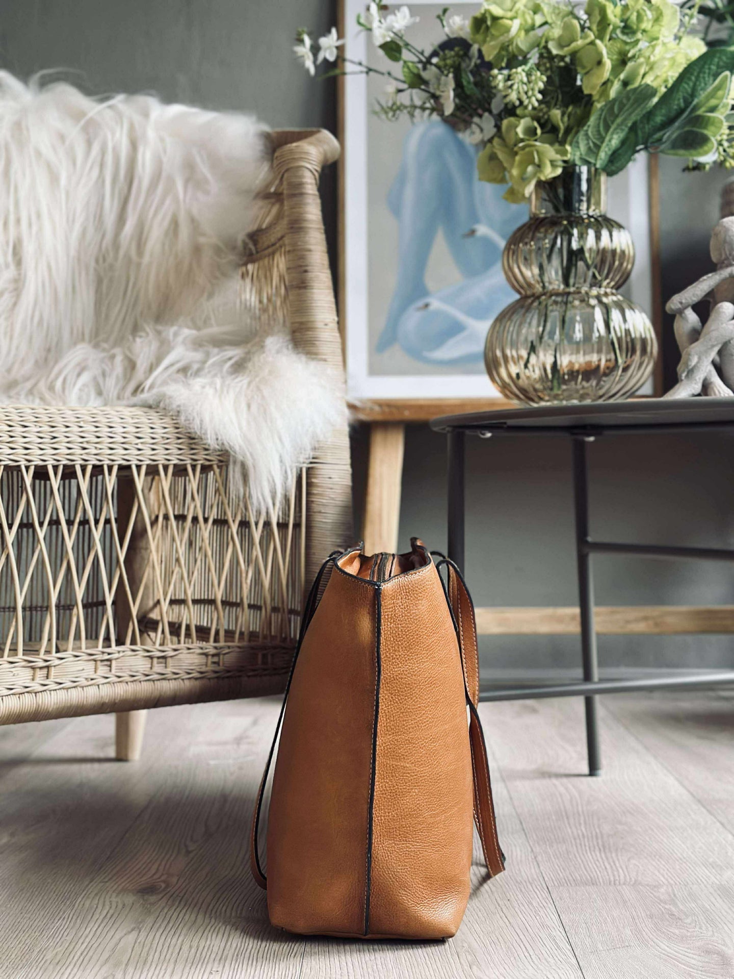 Det ensfargede uttrykket i den cognacfargede nyansen gir et rolig, klassisk uttrykk som passer godt inn i en moderne hverdagsstil.