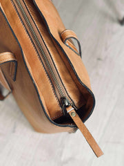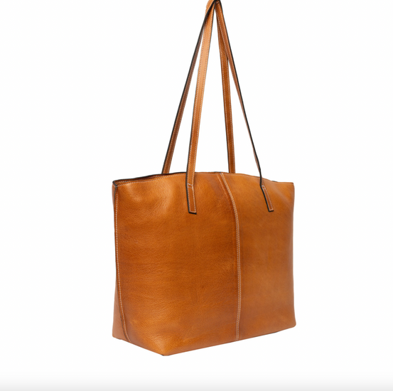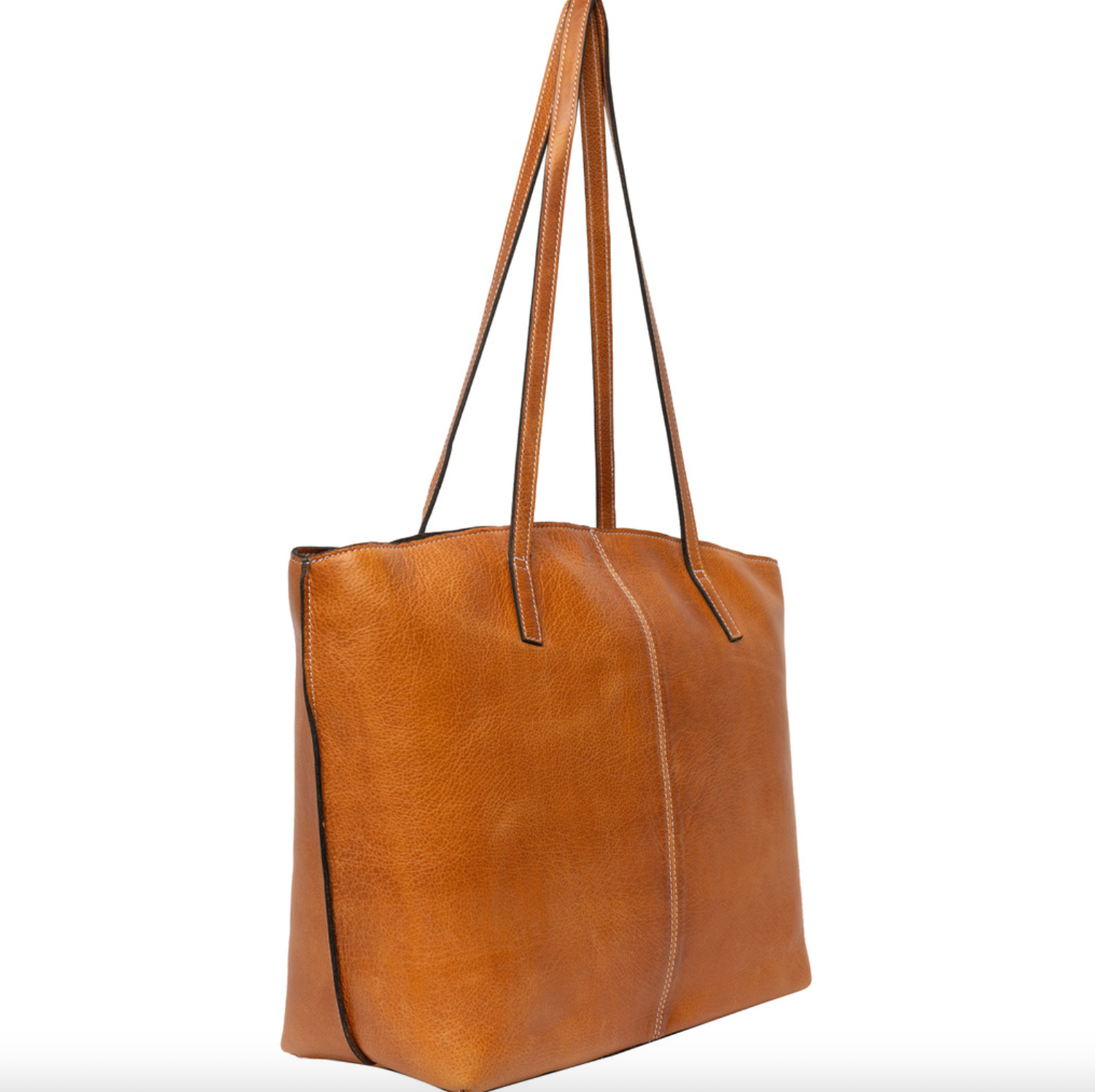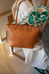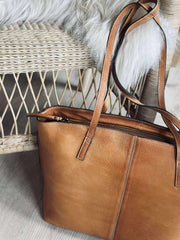 Vesken er laget i skinn og har et ensfarget design i cognac, som understreker et tidløst og enkelt uttrykk.