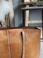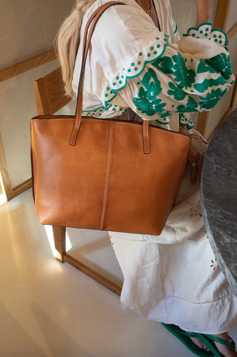 Work Bag - Malou Cognac er en stilfull og praktisk arbeidstaske i skinn, laget for å gjøre det enkelt å ha dine daglige ting samlet. Vesken har et romslig hovedrom, slik at du kan holde orden på nødvendighetene gjennom dagen.