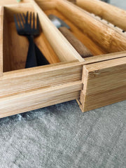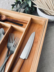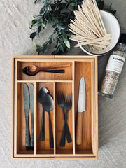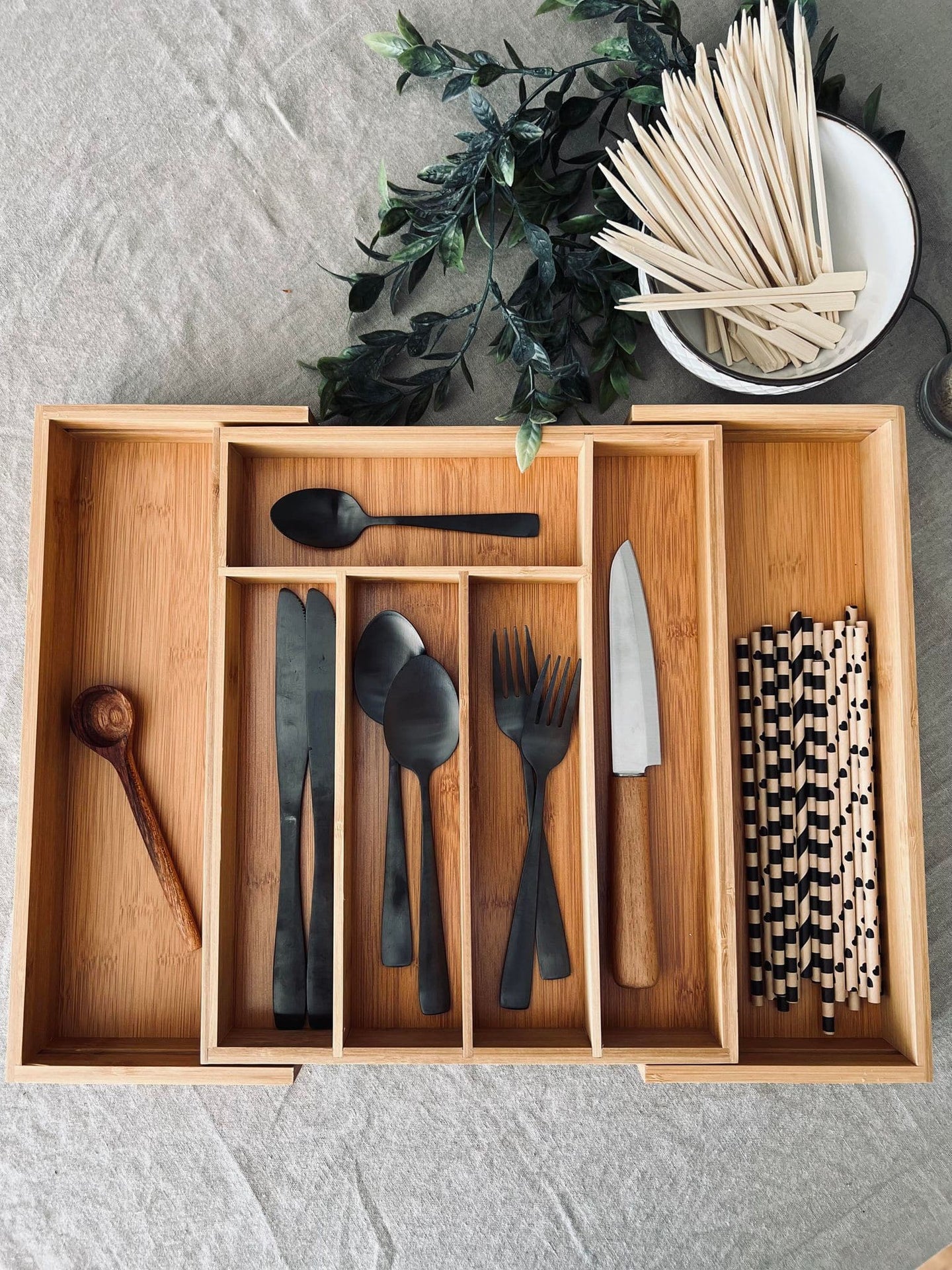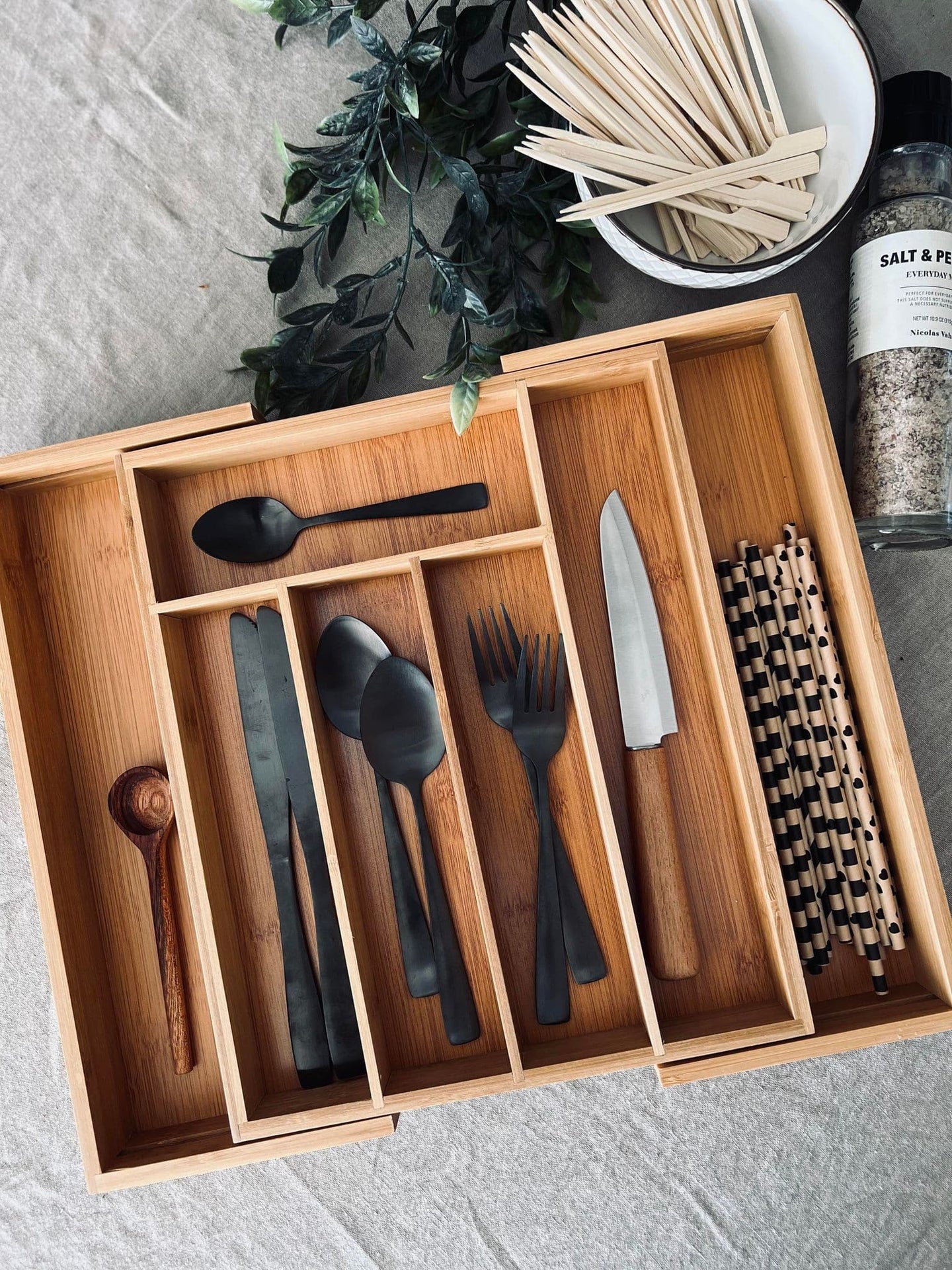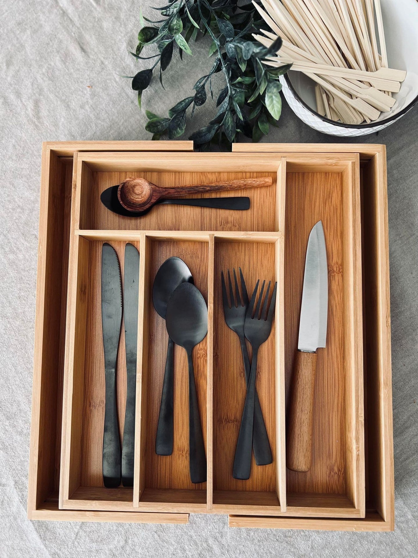 Lei av rot i kjøkkenskuffene? Denne justerbare bestikkskuffen i tre hjelper deg med å organisere bestikket uten stress. Tilpass den etter skuffestørrelsen for optimal utnyttelse av plassen, og hold alt lett tilgjengelig og pent organisert.