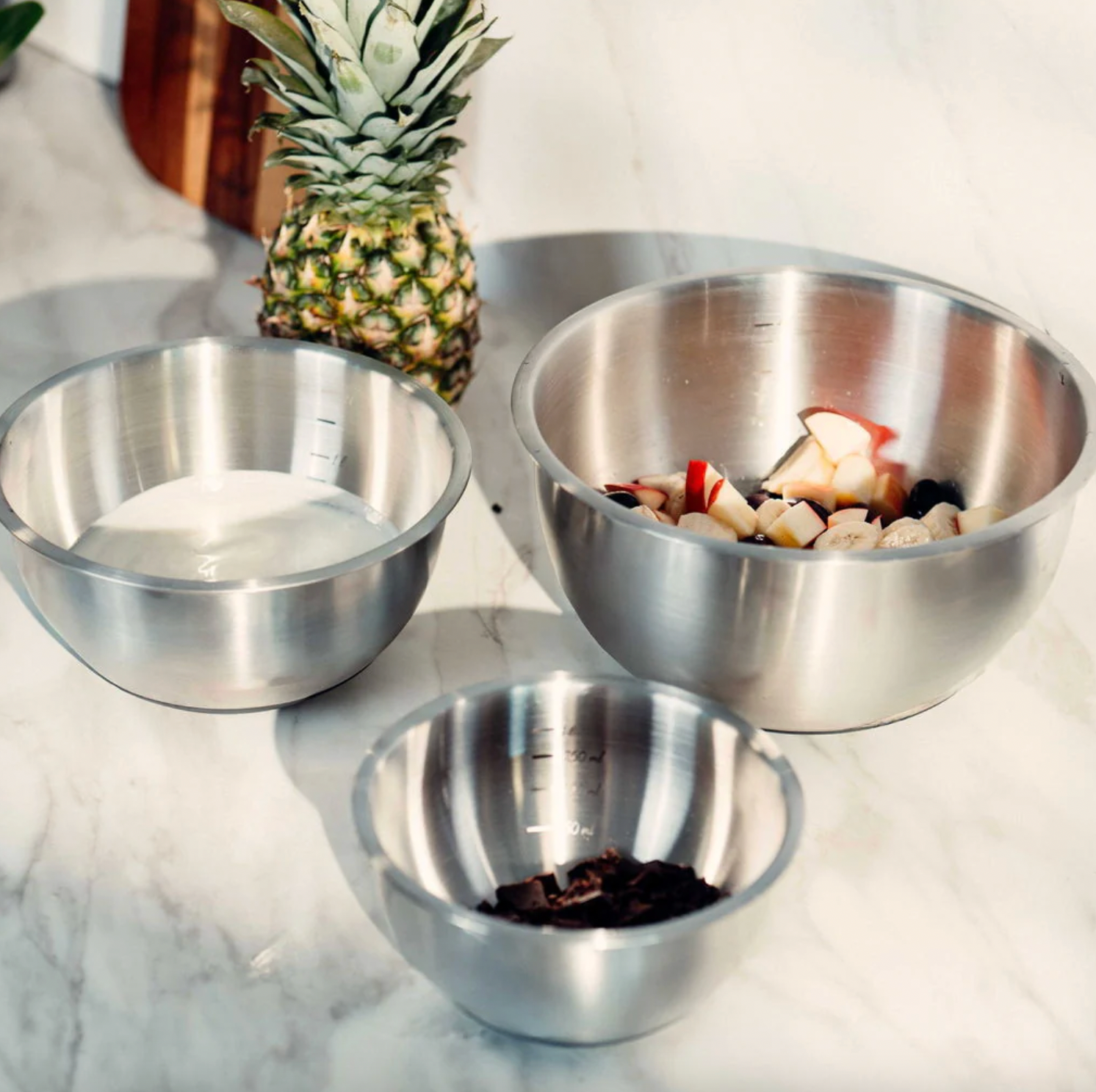 Røreskålsettet består av tre rustfrie skåler, hver med et BPA-fritt lokk. Dette designet sikrer at ingrediensene dine holdes friske og beskyttet mot ytre faktorer. De rustfrie materialene gir holdbarhet og enkel rengjøring, mens de BPA-frie lokkene gir trygghet for helsen din. Skålene kan stables for enkel oppbevaring, noe som sparer plass på kjøkkenet.