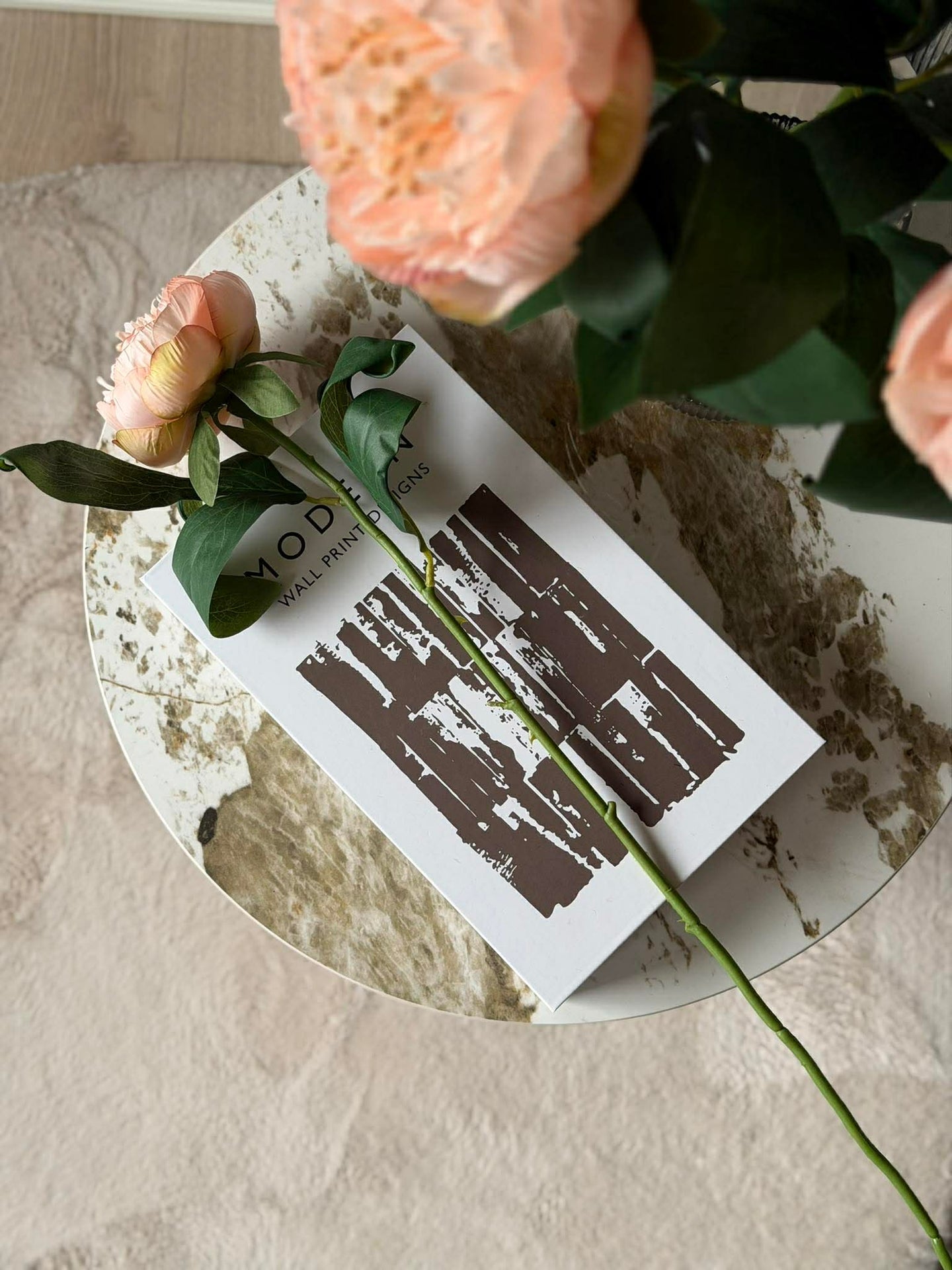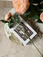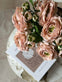 Blomsten er utført som silkeblomst og har en sart rosa fargetone, som passer inn i en lys og nedtonet fargepalett.