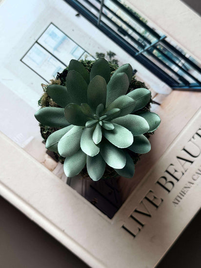 Den kunstige sukkulenten gir et realistisk utseende uten behov for vedlikehold. Plasseringen på en kunstig base gir stabilitet og fleksibilitet i dekorasjonen, slik at den enkelt kan integreres i ethvert rom. Denne løsningen er ideell for travle husholdninger eller kontorer hvor naturlig lys kan være begrenset, samtidig som den tilfører et naturlig preg til omgivelsene.