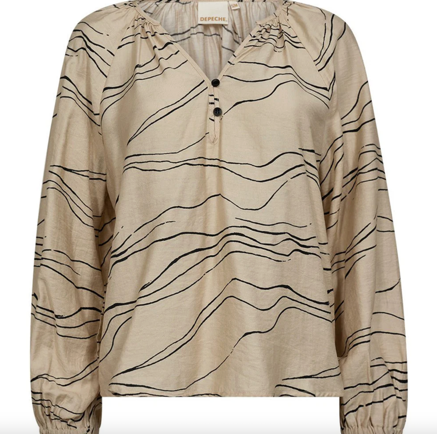 Blusen er i viskose og har et grafisk/geometrisk mønster som tilfører uttrykket karakter uten å virke tungt. Den beige nyansen gjør den lett å kombinere med både nøytrale og mørkere farger.