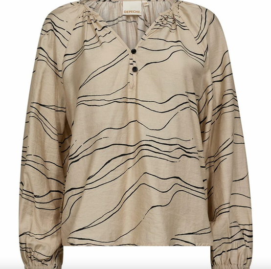 Bluse Evy - Cream Graphic fra Depeche er en klassisk og stilig bluse som passer godt inn i en allsidig garderobe. Den beige fargen kombinert med et grafisk/geometrisk mønster gir et rolig, men markant uttrykk, som fungerer både til hverdags og ved mer festlige anledninger. Passformen er regular, så den føles komfortabel og er enkel å style.