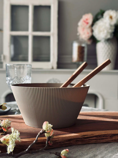 Skålen er laget av beige plast, noe som gir den en nøytral og tilpasningsdyktig estetikk som passer inn i ulike kjøkkeninnredninger. Plastmaterialet gjør skålen lett, noe som gjør den enkel å håndtere, samtidig som den er slitesterk nok til daglig bruk. Den beige fargen har en varm tone som kan komplementere andre elementer på kjøkkenet og skaper en harmonisk atmosfære.