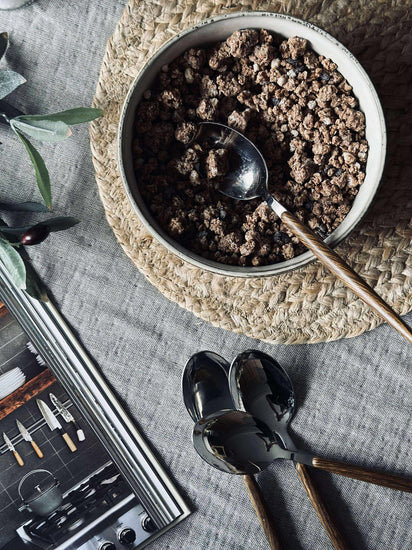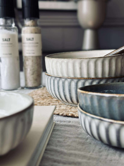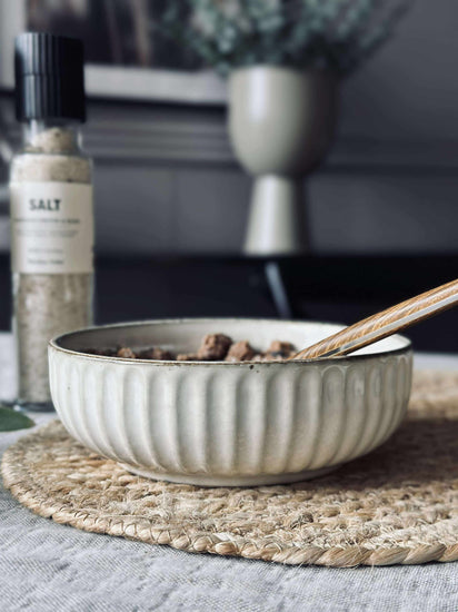 Skålen er laget av ekte stentøy, noe som gir den en robust og holdbar kvalitet. Materialet tåler daglig bruk og beholder sitt estetiske uttrykk over tid. Den naturlige teksturen i stentøyet gir en tidløs følelse, samtidig som det skaper en varm og innbydende atmosfære på spisebordet. Stentøyets egenskaper gjør at skålen holder varmen godt, noe som er ideelt for servering av varme retter.