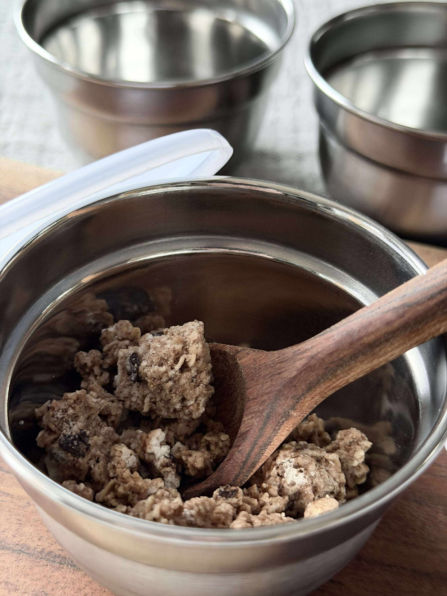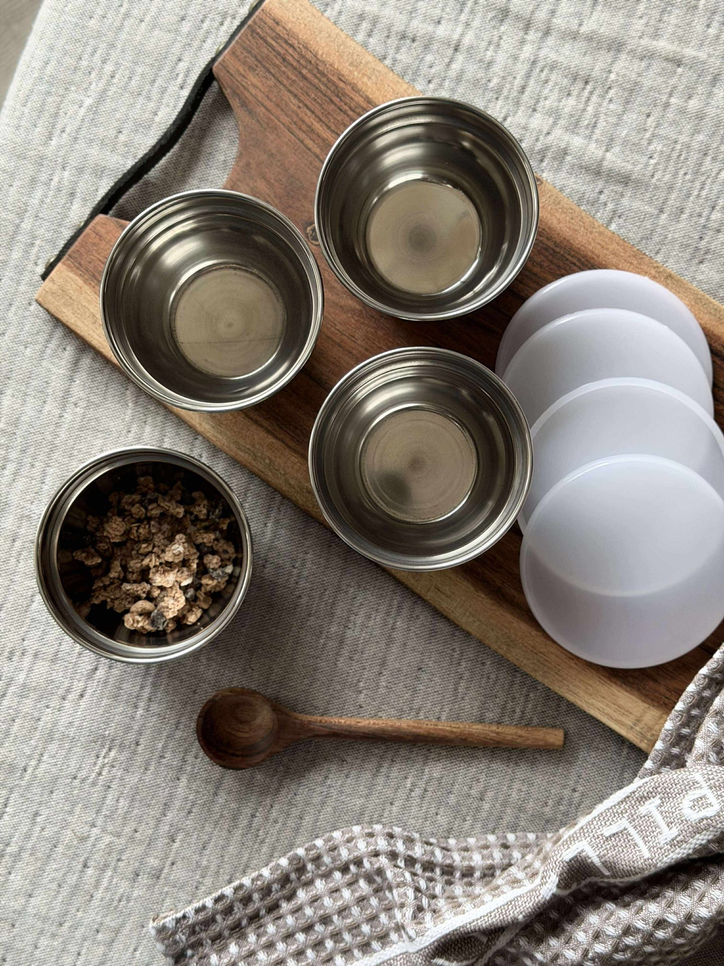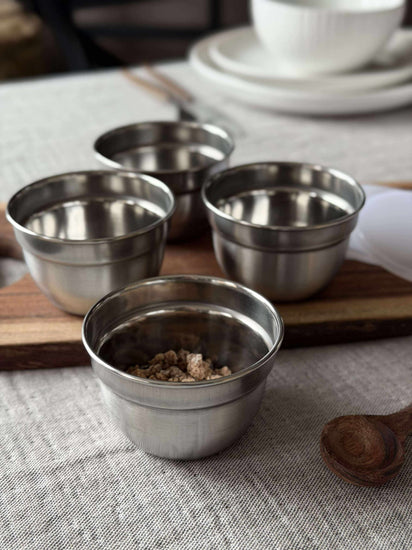 - Skålesettet inneholder fire små skåler i ekte rustfritt stål