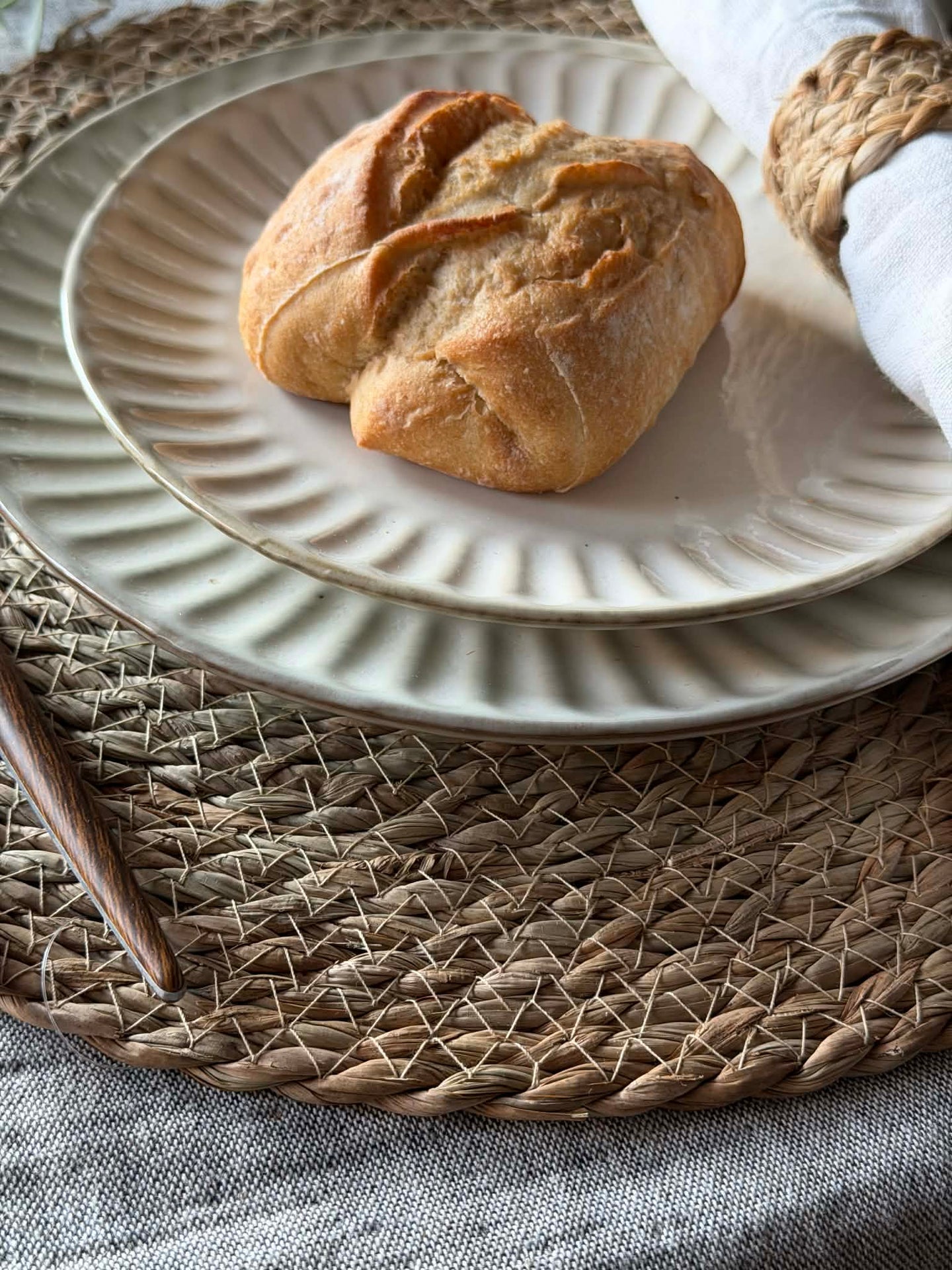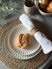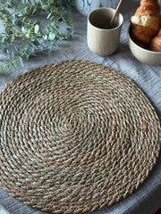 Rund bordbrikke i sjøgress i en naturlig nyanse, som gir borddekningen et rolig og varmt uttrykk. Formen gjør den lett å plassere under tallerkener og glass, både til hverdagsmåltider og når du dekker bord for gjester.