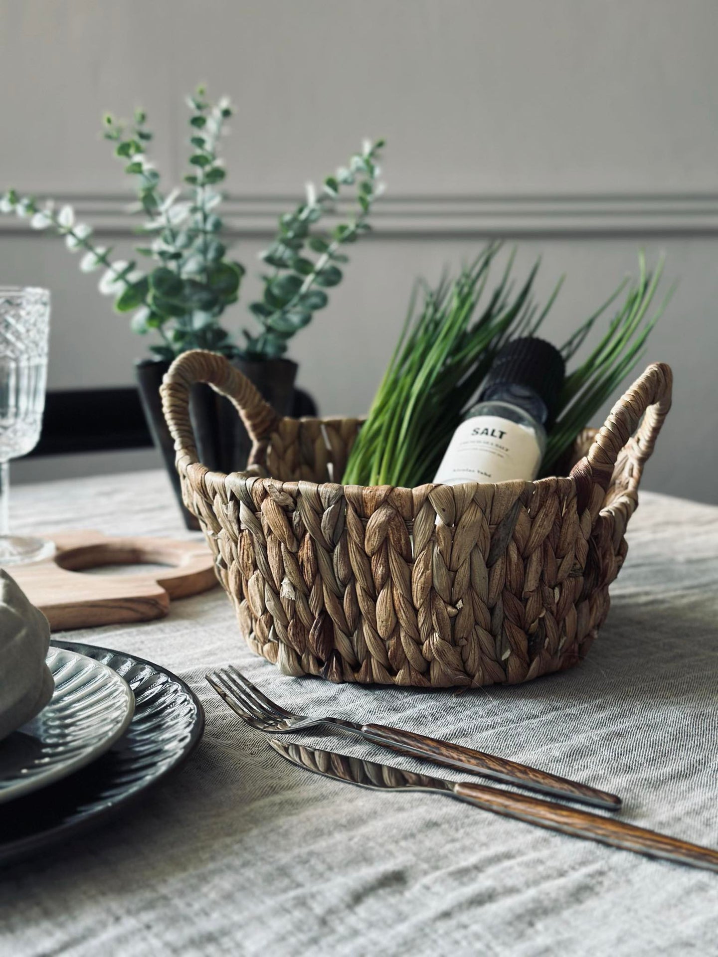 Brødkurven er laget av vannhyasint, et bærekraftig materiale som gir en varm og innbydende følelse i hjemmet. Vannhyasint er kjent for sin holdbarhet og fleksibilitet, noe som gjør kurven både funksjonell og langvarig. Materialets naturlige tekstur tilfører en organisk estetikk som enkelt kan komplementere ulike interiørstiler. I tillegg er den lett å rengjøre, noe som gjør den praktisk for daglig bruk.