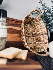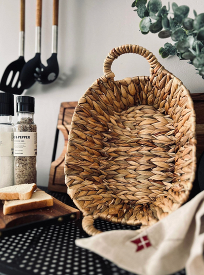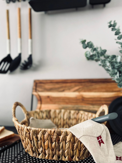 Brødkurven er laget av vannhyasint, et materiale som ikke bare gir et naturlig og varmt uttrykk, men som også er miljøvennlig. Vannhyasinten er kjent for sin holdbarhet og fleksibilitet, noe som gjør kurven robust og lett å håndtere. Dette materialet tilfører en subtil tekstur til interiøret, samtidig som det bidrar til en bærekraftig livsstil.