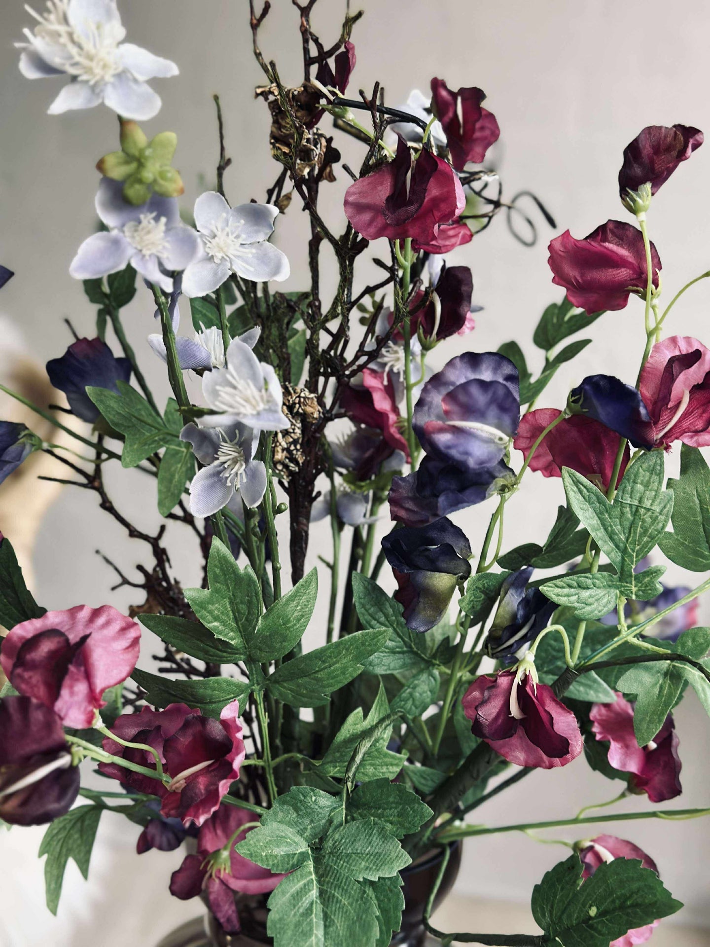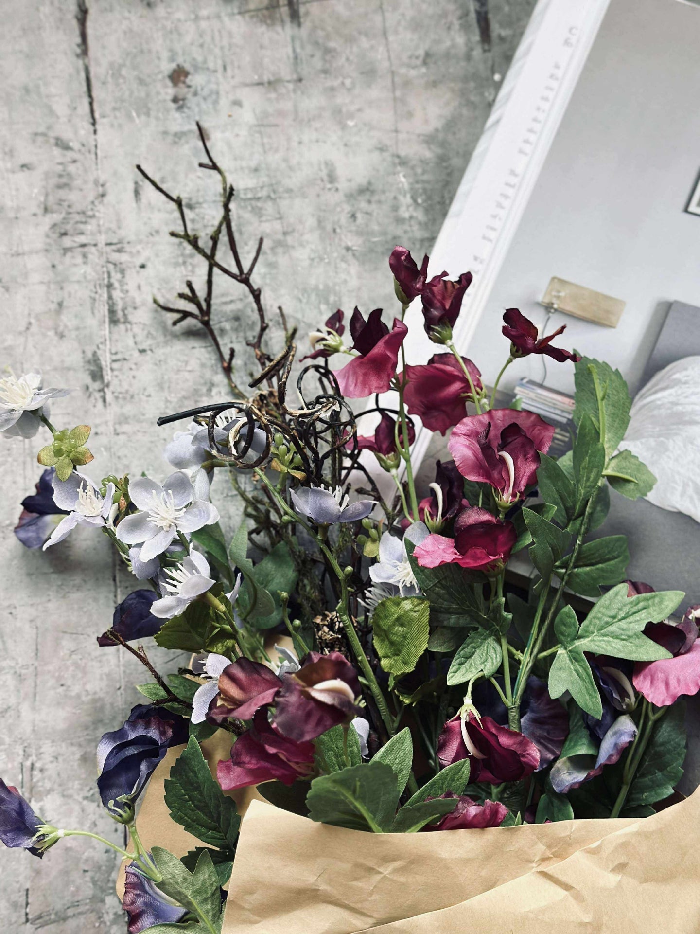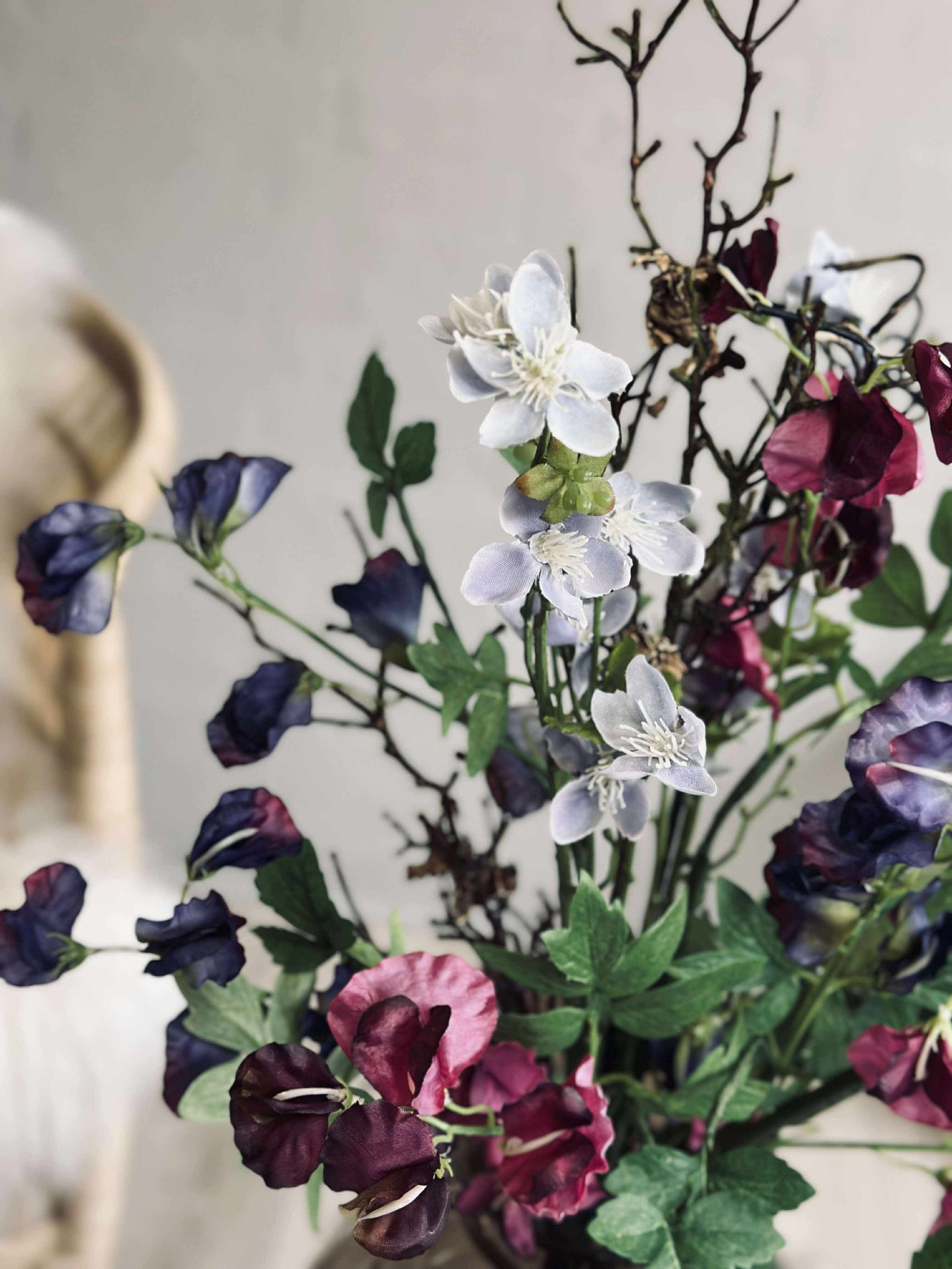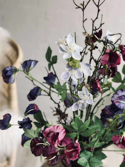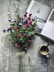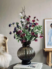 Den kunstige blomsterbuketten er laget av plast og tekstil, noe som gir den et naturlig utseende uten behov for vedlikehold. Disse materialene sikrer at buketten bevarer sin form og farge over tid, selv under varierende lysforhold. Dette gjør den ideell for de som ønsker en vedvarende dekorativ løsning som ikke krever vanning eller spesifikke lysforhold.