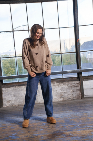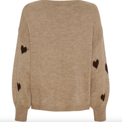 Strikk Clover Knit - Fango er en søt strikkegenser med hjerteprint i en rolig beige nyanse. Den oversizede passformen og de løse ermene gir et avslappet uttrykk som er lett å få til å fungere i hverdagen.