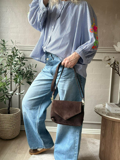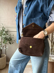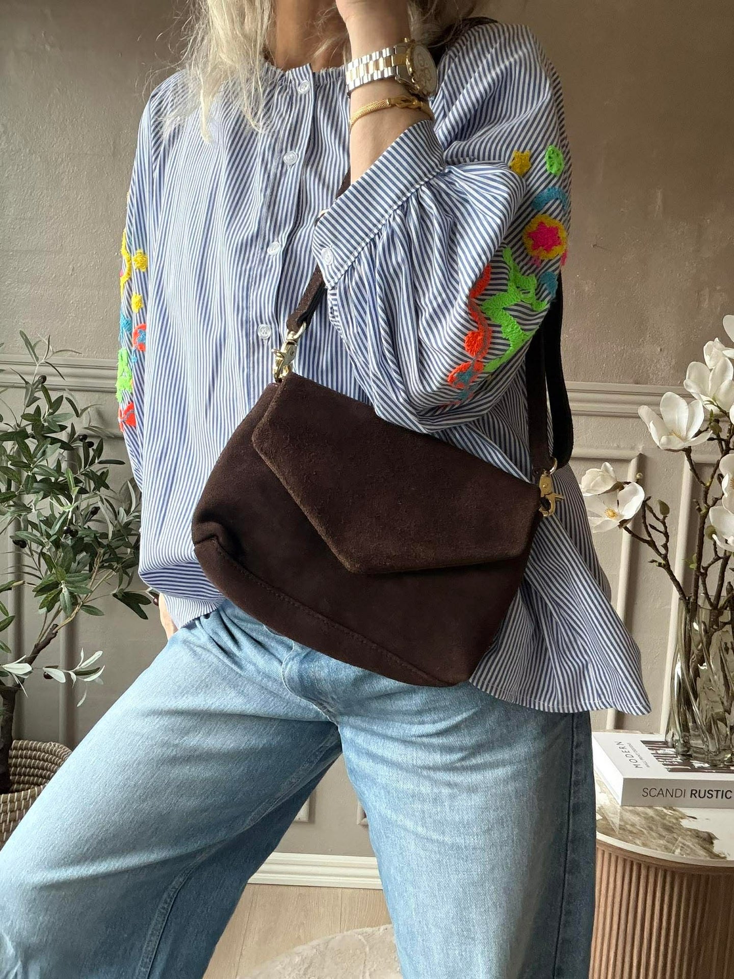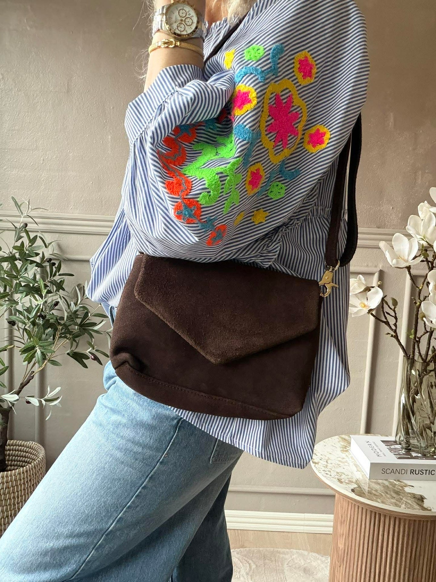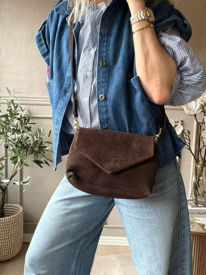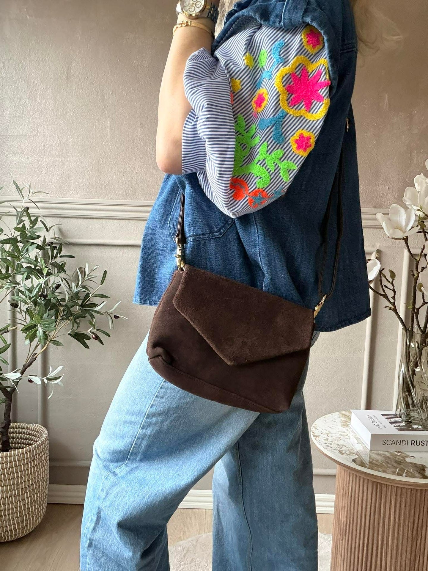 Forenkle hverdagen din med 'Crossover semsket skinn - Sjokolade'. La denne vesken bli din trofaste følgesvenn som holder styr på nødvendighetene dine med stil. Utforsk friheten ved å ha alt du trenger lett tilgjengelig, mens du beveger deg gjennom dagen med selvtillit og eleganse.