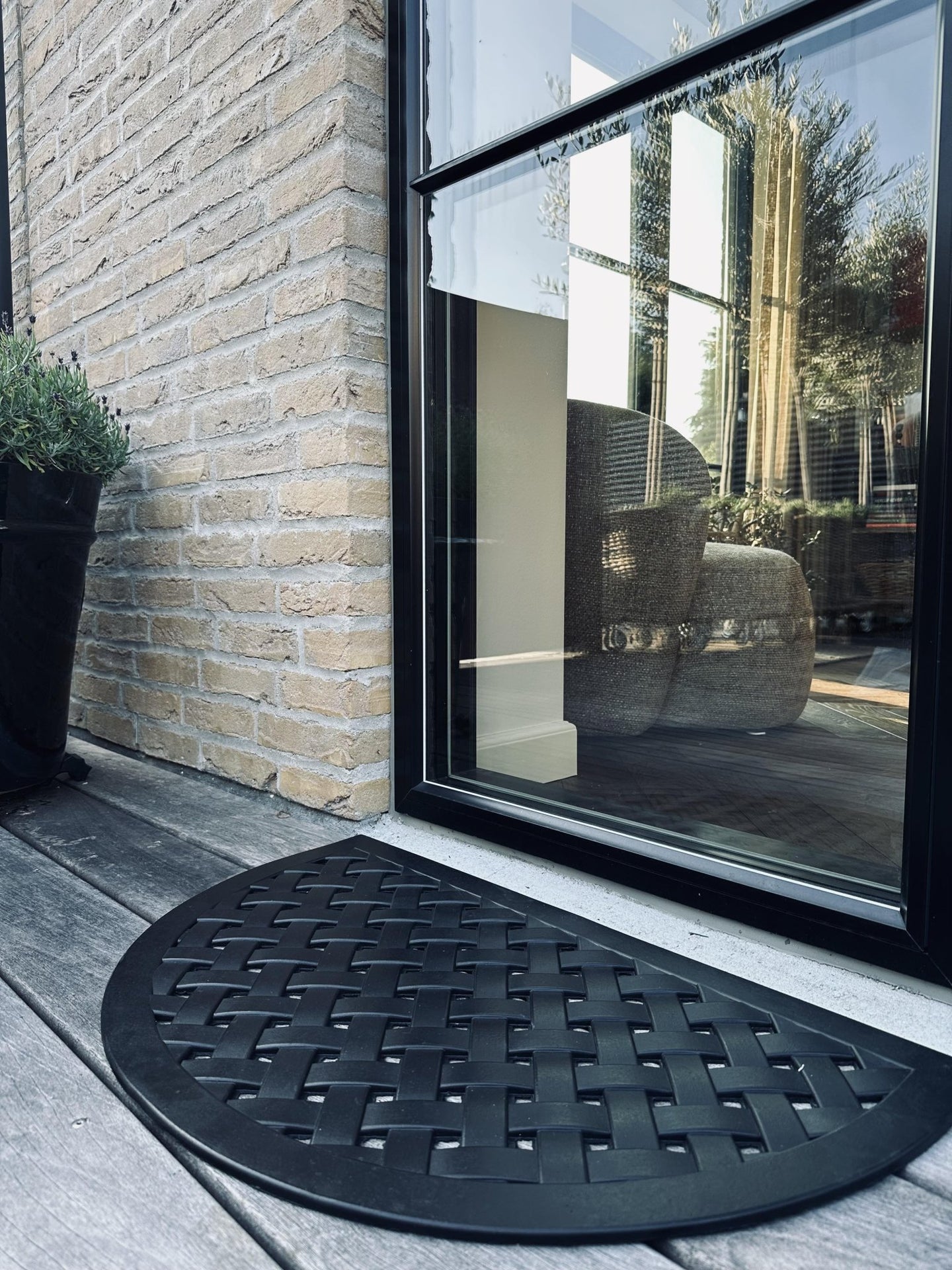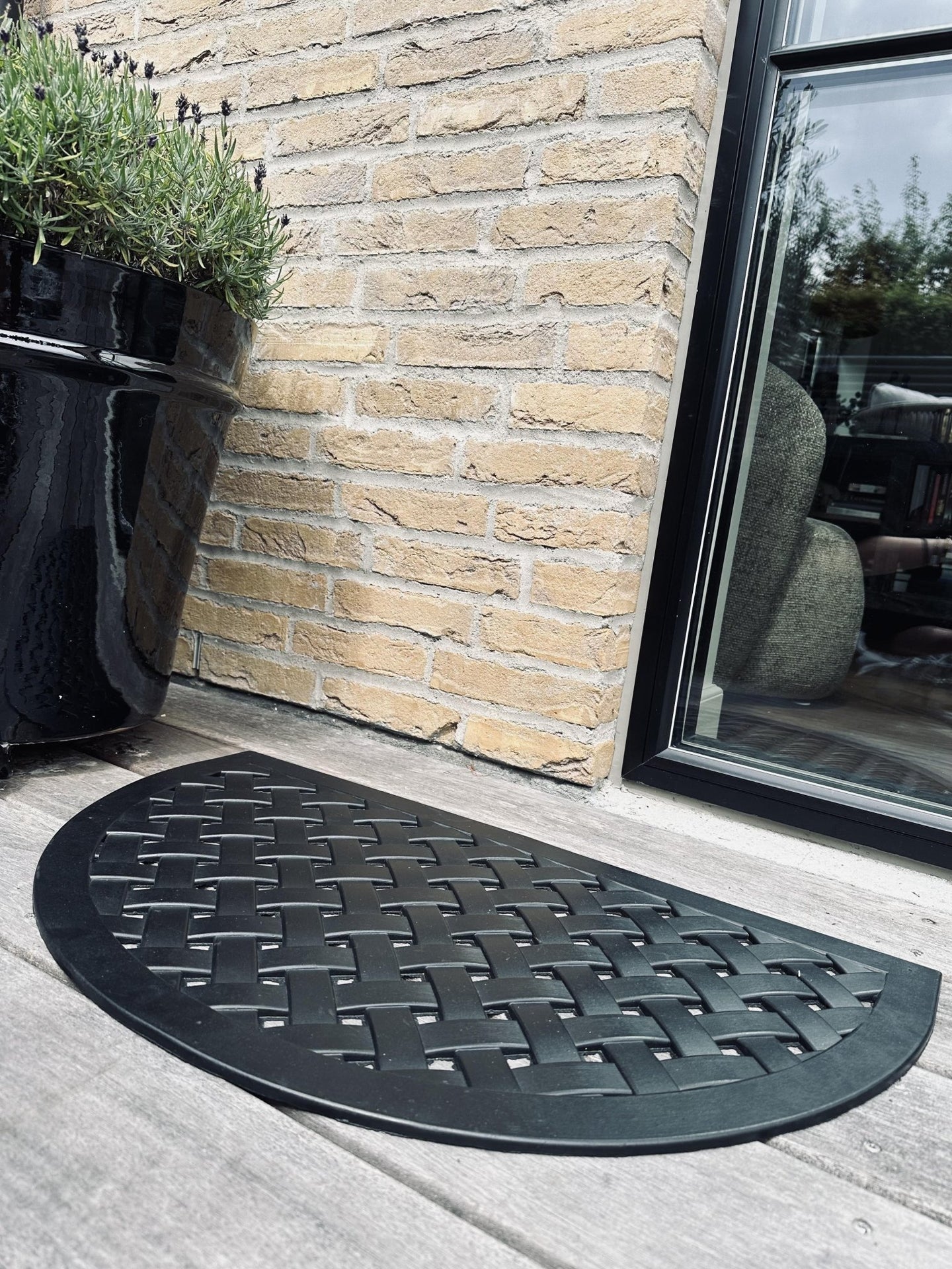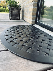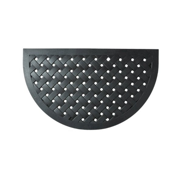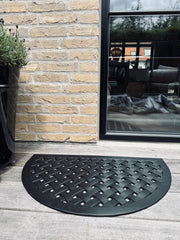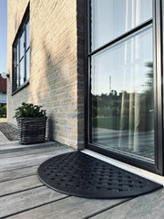 Dørmatte - Svart halvmåne er en pen og klassisk utendørsmatte i svart gummi med et strukturert, vevd uttrykk. Den halvmåneformede dørmatten gir et rolig og stilrent førsteinntrykk ved hoveddøren og hjelper med å ta det verste smusset før du går inn. Denne svart dørmatten er et godt valg for entréen.