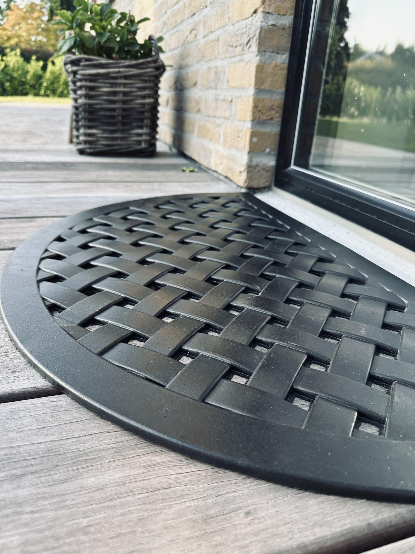 Med sitt kraftige materiale fungerer den som en praktisk smussmatte utendørs, samtidig som den holder et enkelt, tidløst uttrykk. En dormatte/dørmatte i halvmåneformat er også naturlig når du ønsker en mykere form enn den klassiske rektangulære.