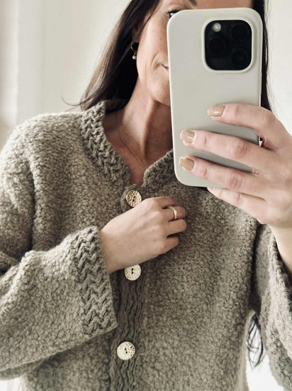 Materialblandingen består av akryl, polyester, alpakka, ull og viskose, som sammen gir cardiganen et mykt og karakterfullt uttrykk.