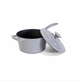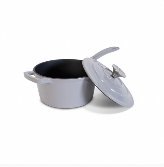 Kasserollen er laget i jern og har et enkelt, ensfarget utseende i grå. Det gir et dempet uttrykk som fungerer godt sammen med både lyse og mørke kjøkkentoner.