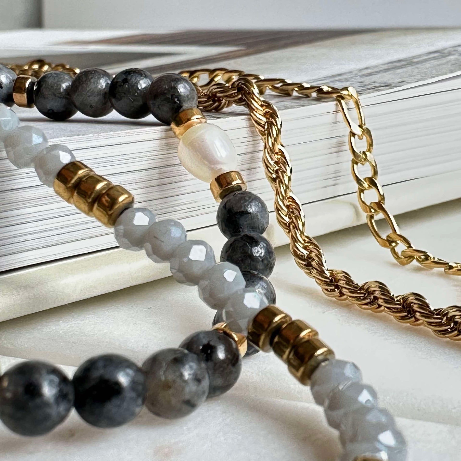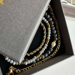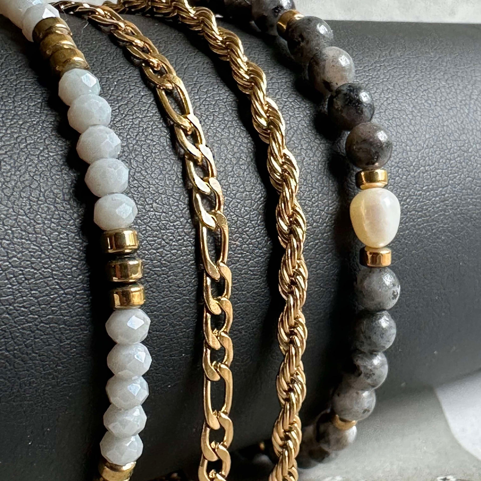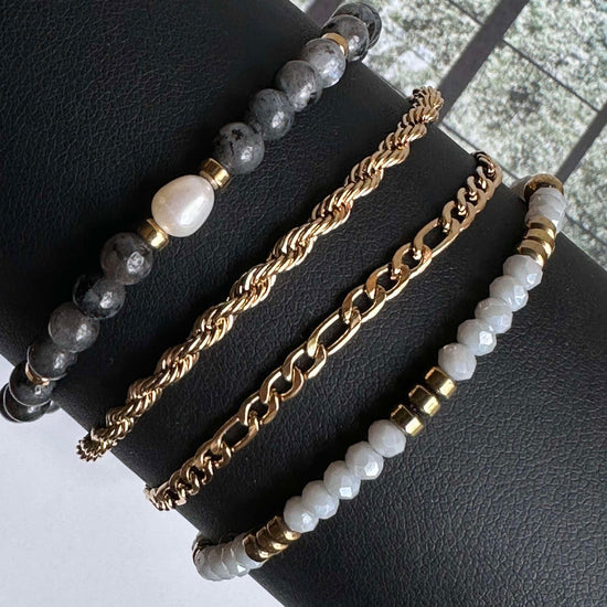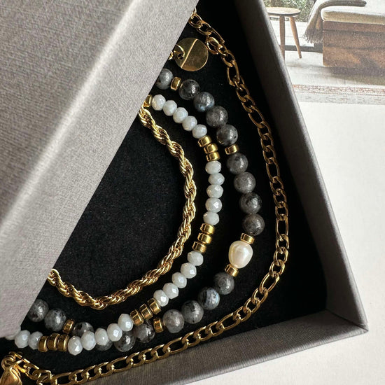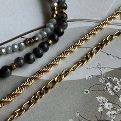 Settet består av ett snoet armbånd og ett lenkearmbånd, begge laget av rustfritt stål og forgylt med 18K gull. Denne kombinasjonen gir en varig glans og robusthet som passer til enhver anledning. Materialvalget sikrer at armbåndene beholder sin estetiske tiltrekning over tid, samtidig som de gir et subtilt hint av luksus til din personlige stil.