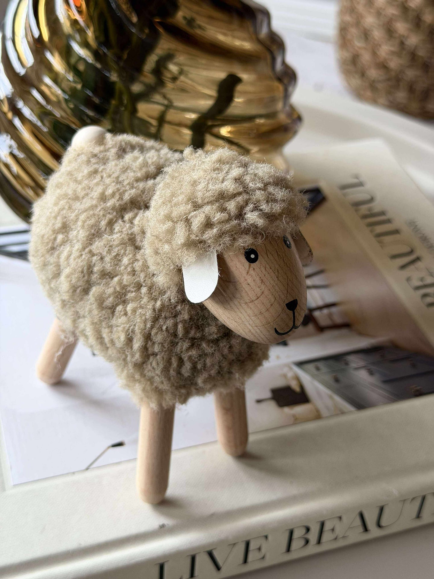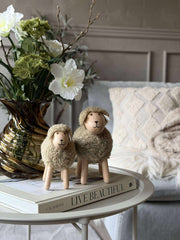 Får Kaki - Mellom er en dekorativ figur i et rolig, ensfarget uttrykk. Den beige fargen gir et mykt og dempet utseende, som er lett å kombinere med både lyse og mørkere nyanser i innredningen. Figuren fungerer som en liten detalj som kan skape varme og personlighet i rommet uten å ta over.