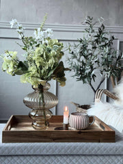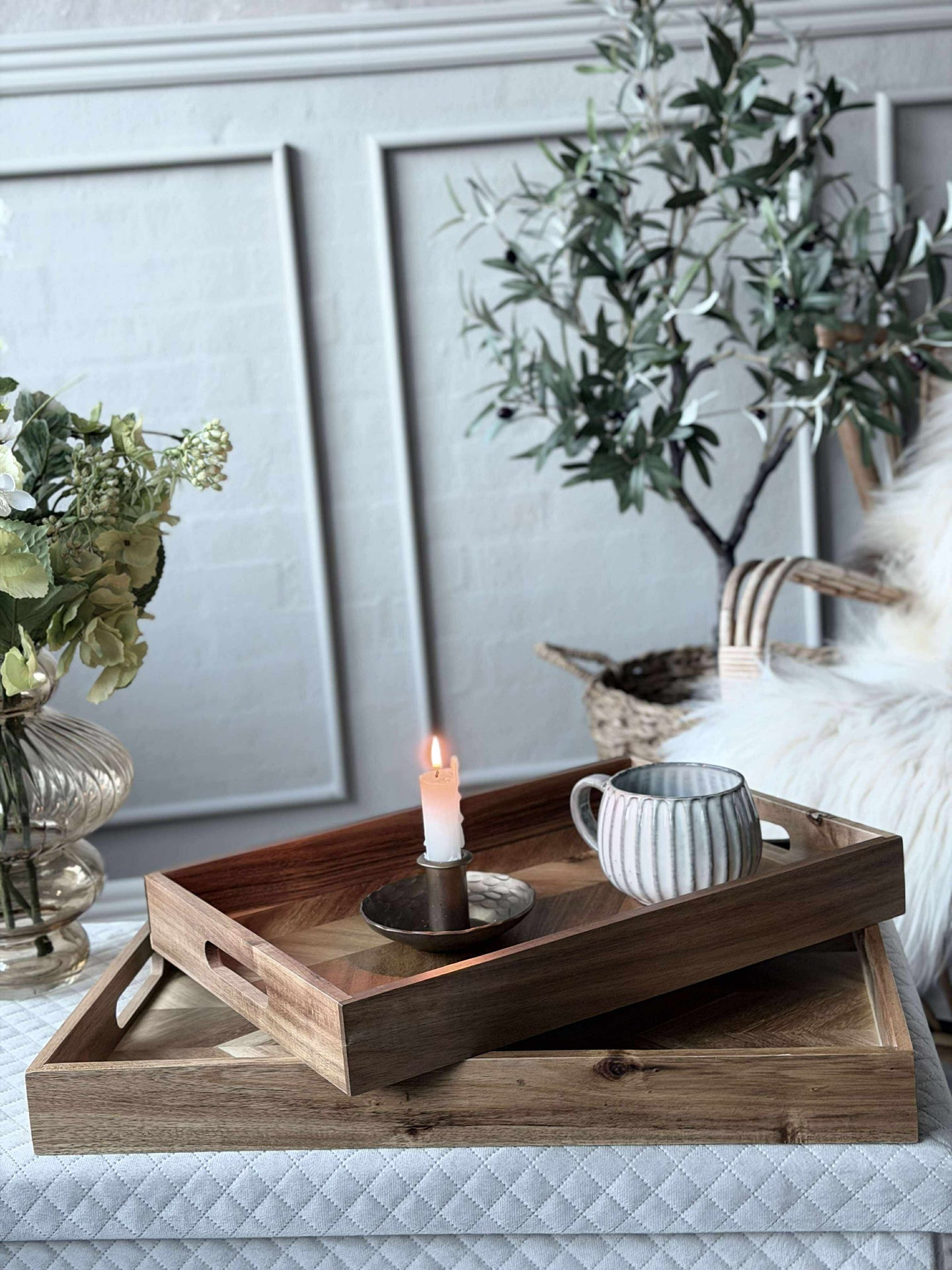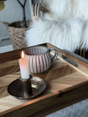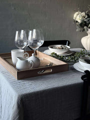 Serveringsbrettet, laget av akasietre, gir en varm og innbydende følelse til enhver servering. Akasietreets naturlige mønstre og fargevariasjoner gir hver brikke et unikt utseende. Materialets holdbarhet sikrer at brettet tåler daglig bruk, samtidig som det bevarer sin estetiske appell. Den glatte overflaten gjør det enkelt å rengjøre, noe som gjør det praktisk for både hverdagsbruk og spesielle anledninger.