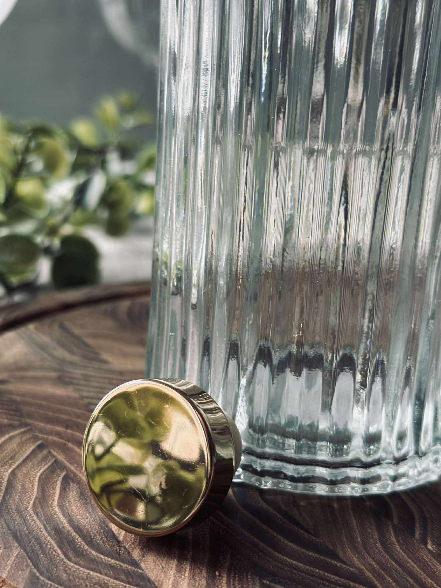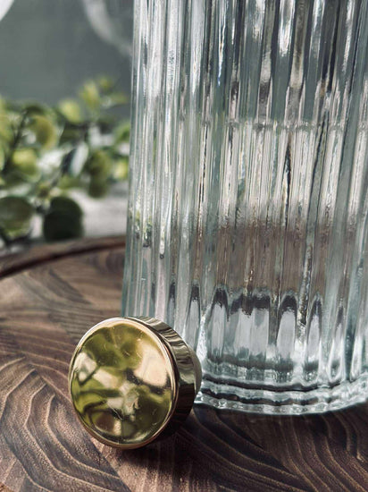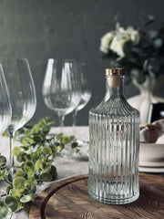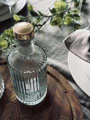 Flasken er i klart glass med et lett strukturert uttrykk, som gir et rolig og klassisk utseende.