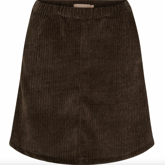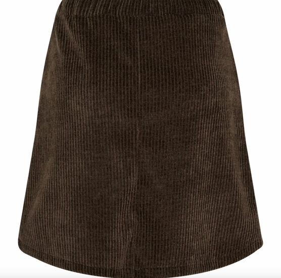 Dette fløyelsskjørtet i fløyel i fargen Moro brown har et varmt, jordnært uttrykk, som faller rolig inn i garderobens fargepalett. Den ensfargede overflaten gir et rent uttrykk, og den mørkebrune nyansen gjør det lett å kombinere på tvers av sesonger. Elastikk i livet gjør skjørtet behagelig og enkelt å ta av og på.