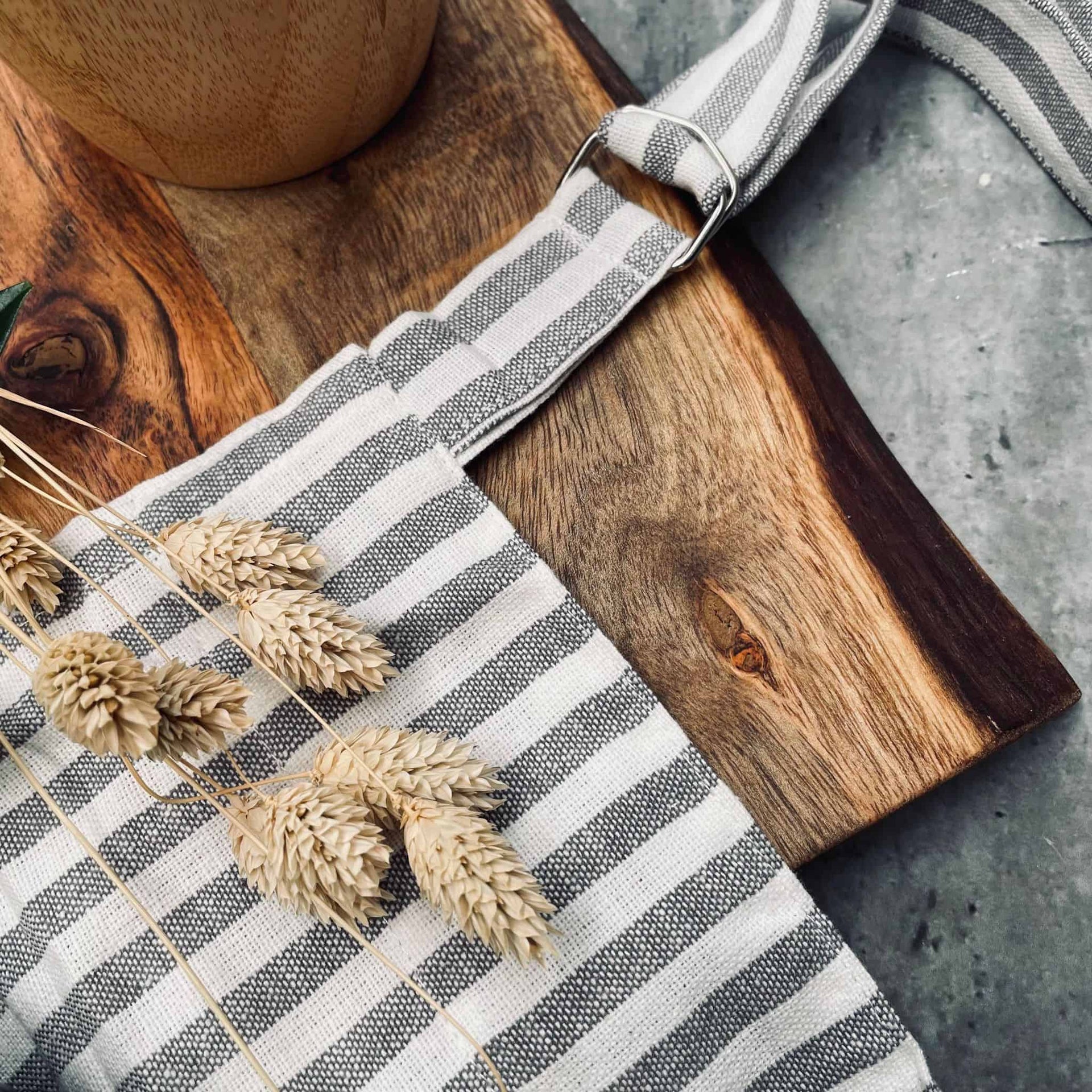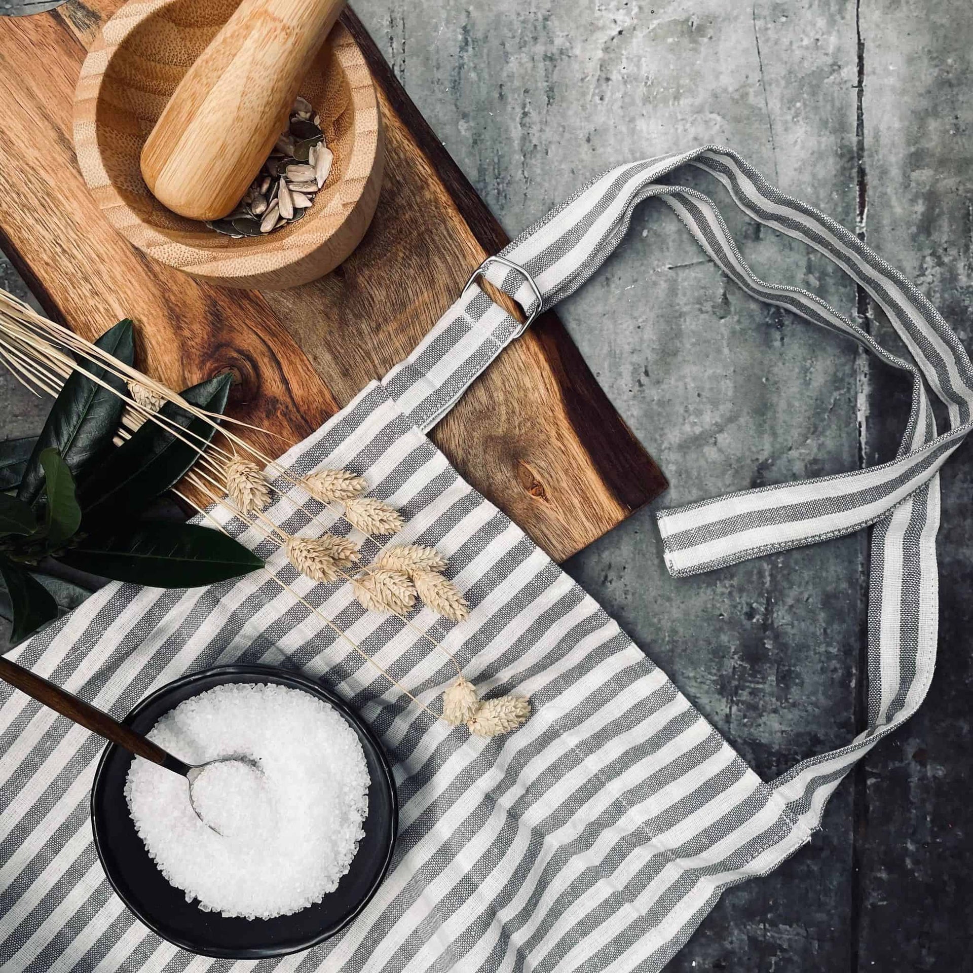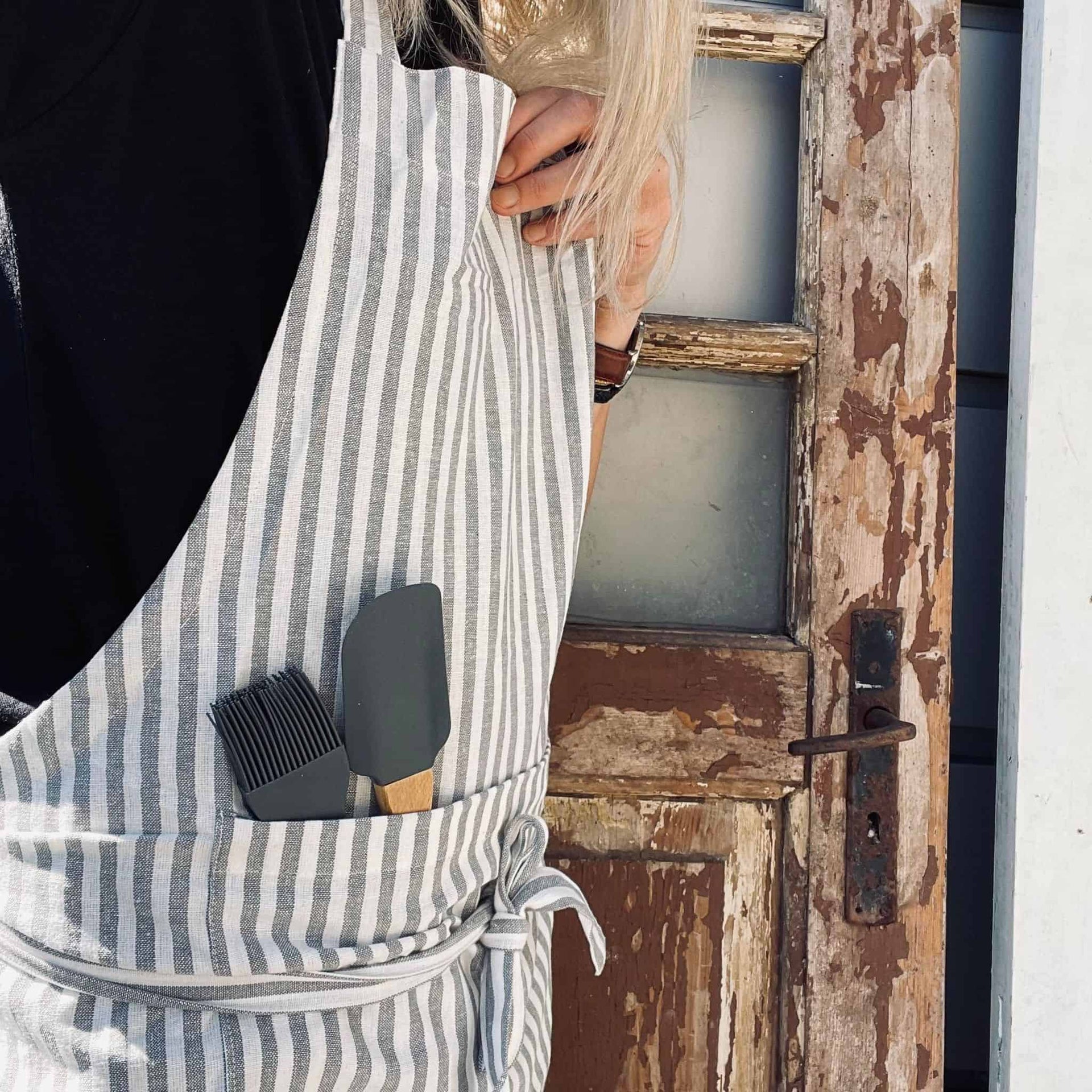 Dette forkleet kombinerer funksjonalitet med stil gjennom sitt design med grå striper. Lommen gir praktisk oppbevaring for små redskaper eller notater, noe som gjør matlagingen mer effektiv. Materialet er slitesterkt og lett å rengjøre, noe som sikrer langvarig bruk på kjøkkenet. Designet gir en moderne estetikk som enkelt kan integreres i ulike interiørstiler.