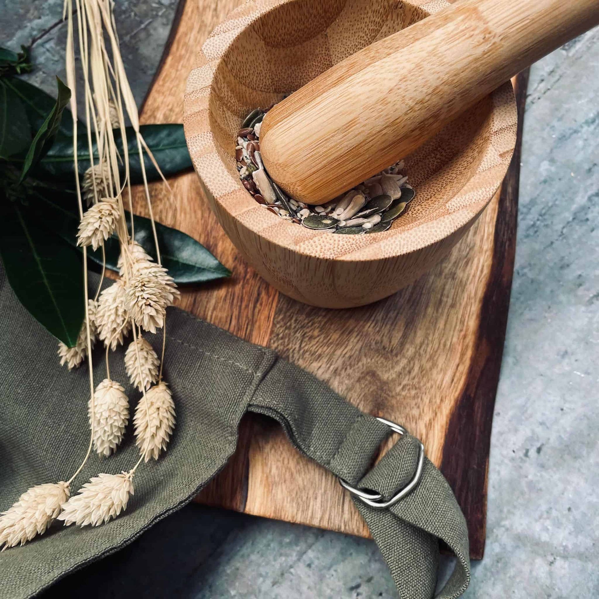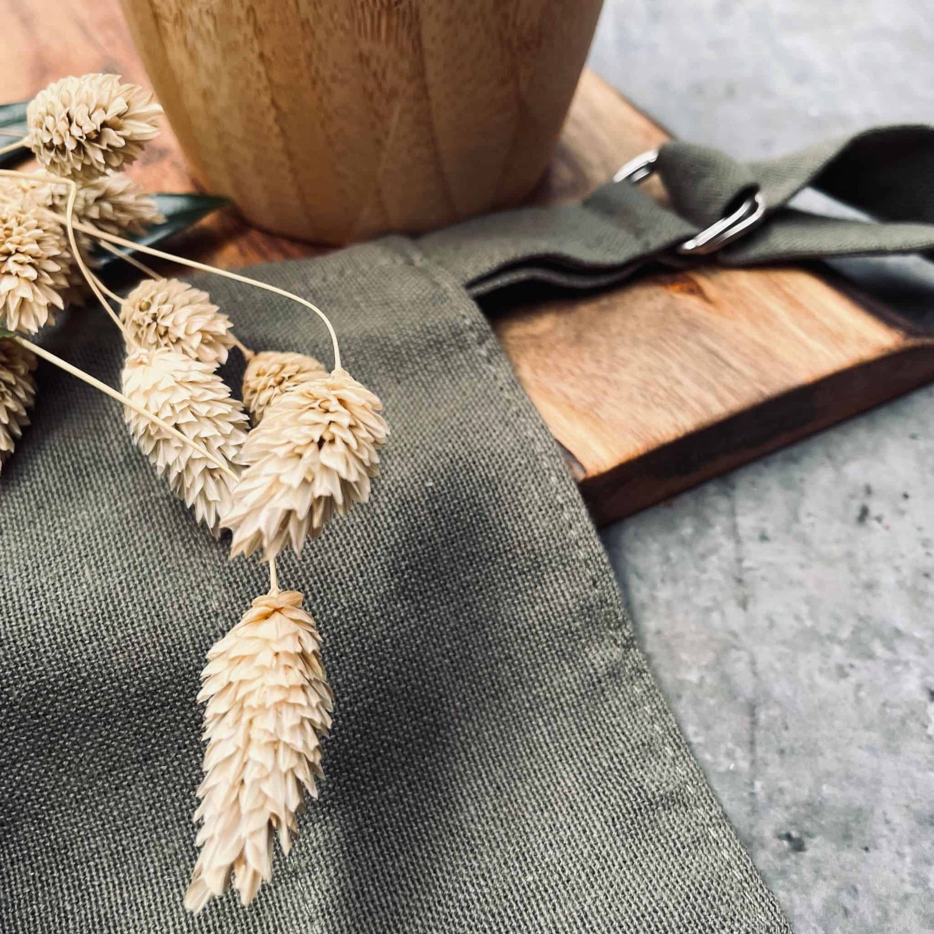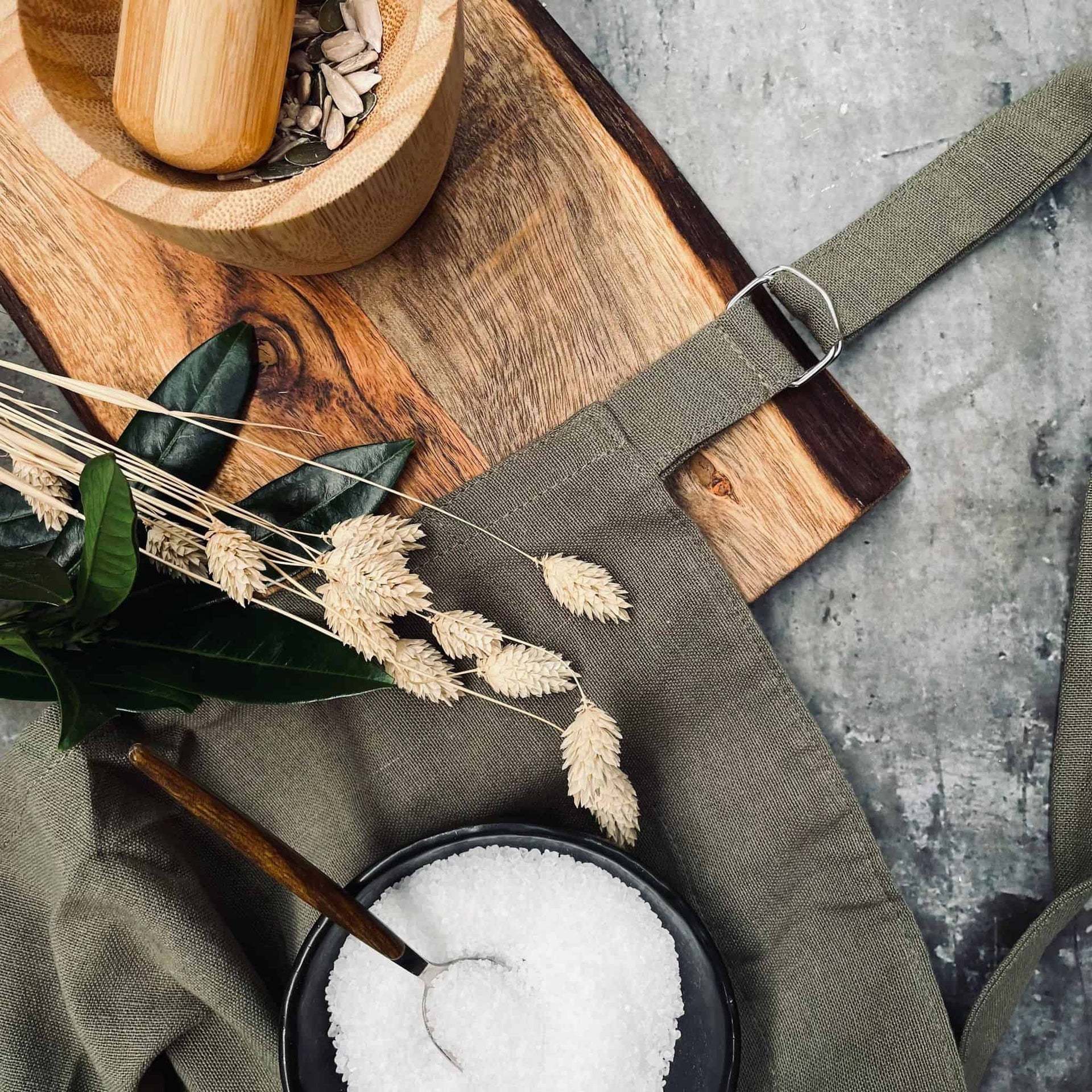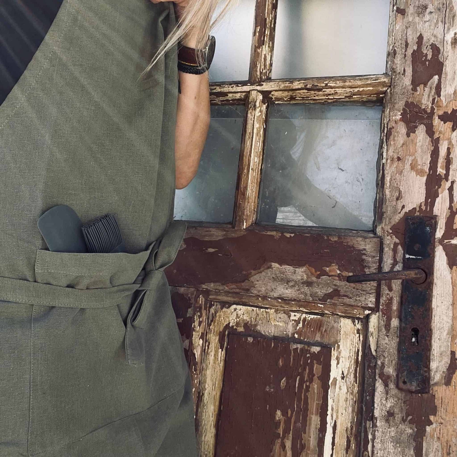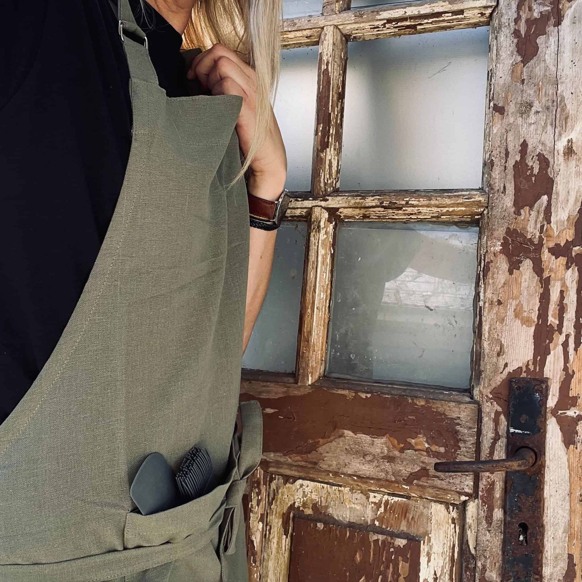 Gjør matlagingen enklere med dette praktiske forkleet i salviegrønt. Det er ideelt for de som ønsker funksjonalitet og stil på kjøkkenet. Forkleet bidrar til å holde klærne rene, samtidig som du har verktøyene du trenger lett tilgjengelig.