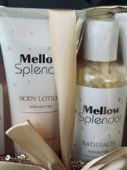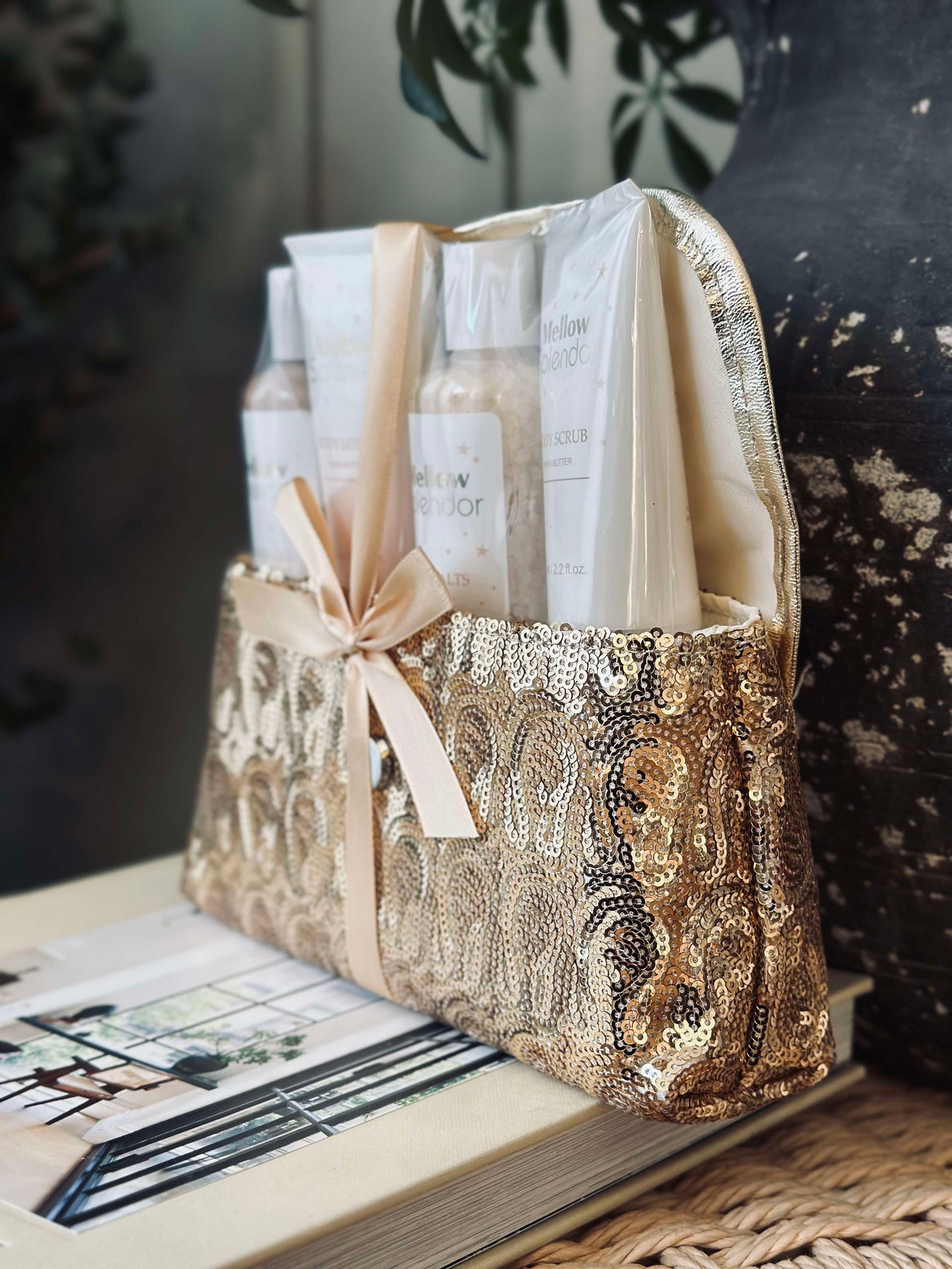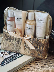 Settet inneholder dusjgelé, bodylotion, badesalt og kroppsskrubb, som sammen gir en fullverdig spa-lignende opplevelse hjemme. Dusjgeléen renser skånsomt, mens bodylotionen tilfører fuktighet og etterlater huden myk. Badesaltet bidrar til avslapning i badekaret, og kroppsskrubben fornyer huden ved å fjerne døde hudceller. Disse produktene arbeider sammen for å gi en følelse av velvære og forfriskning.