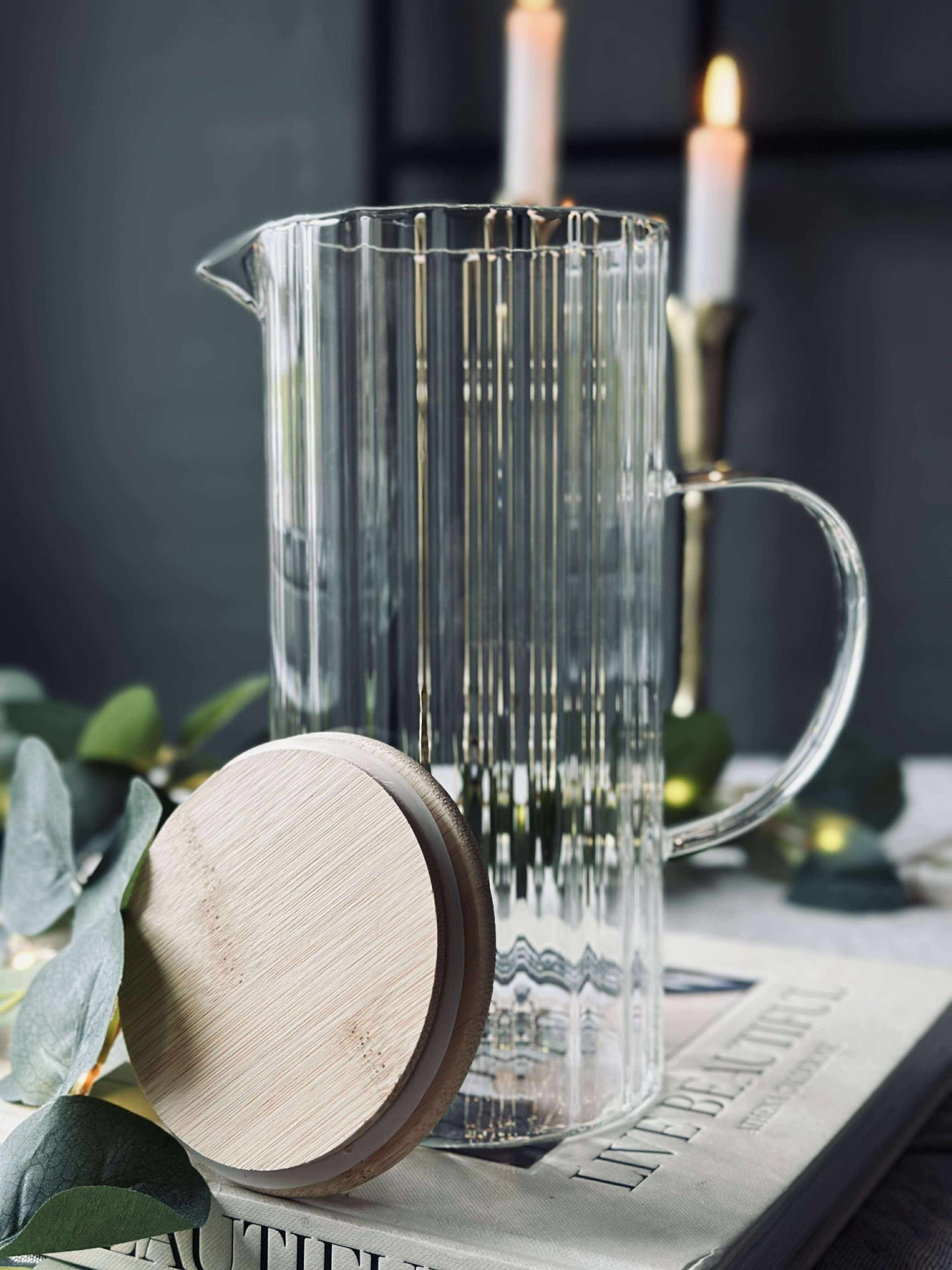 Unngå søl og nyt en ryddig servering med en glasskanne som kombinerer funksjonalitet og stil. Med et praktisk bambuslokk kan du enkelt oppbevare drikke og servere med letthet. Forenkle hverdagen med et tiltalende og praktisk design.