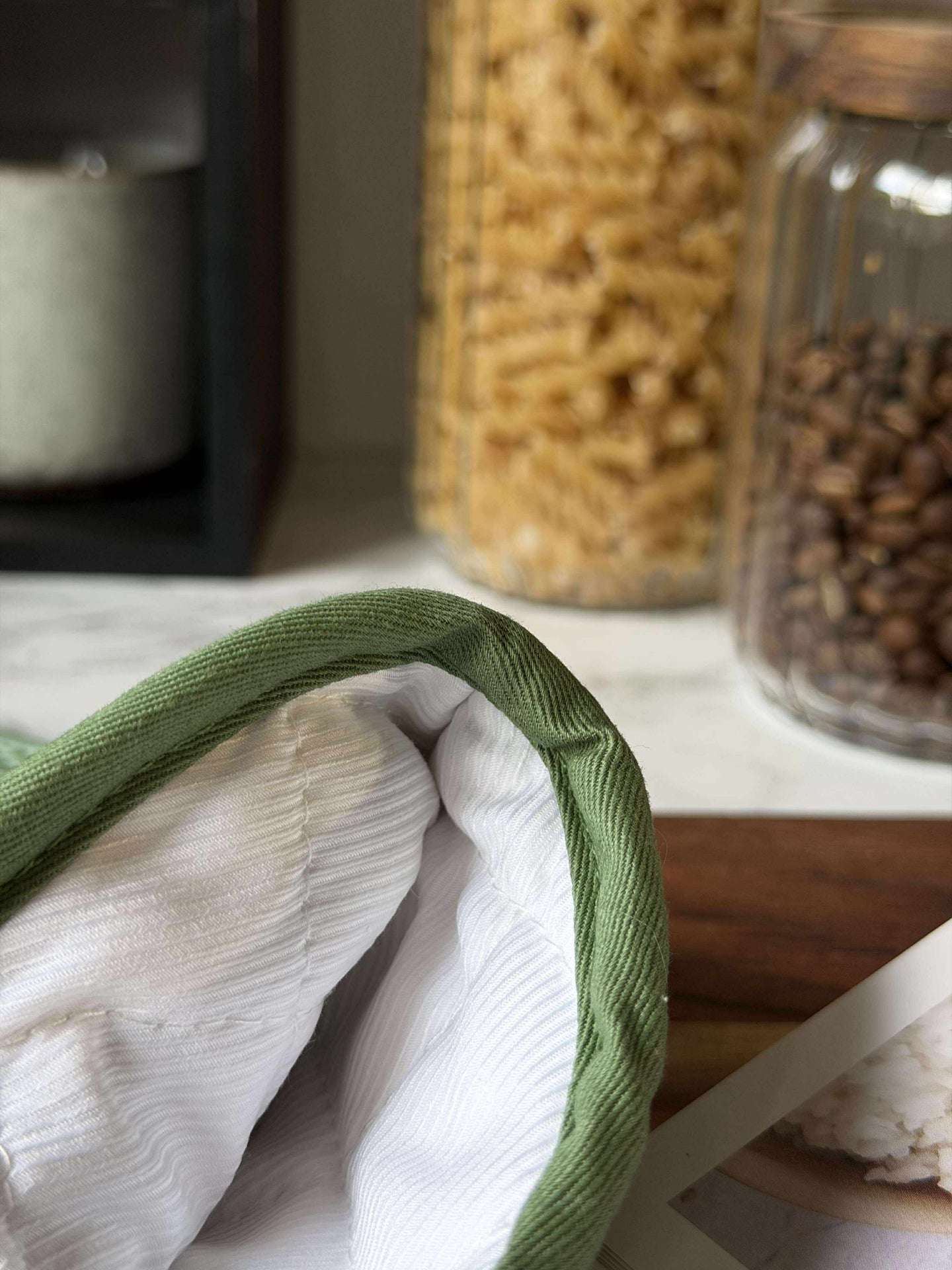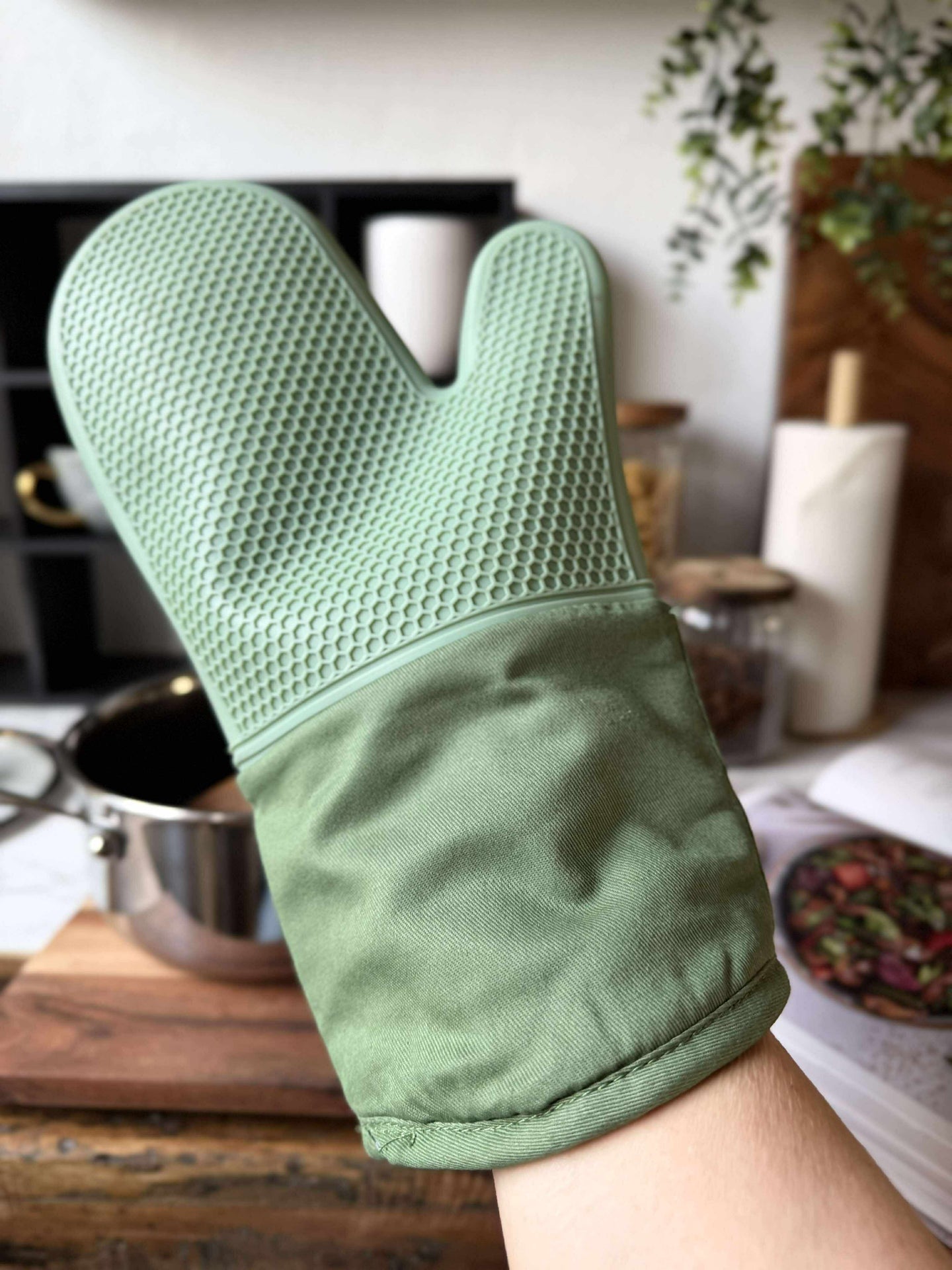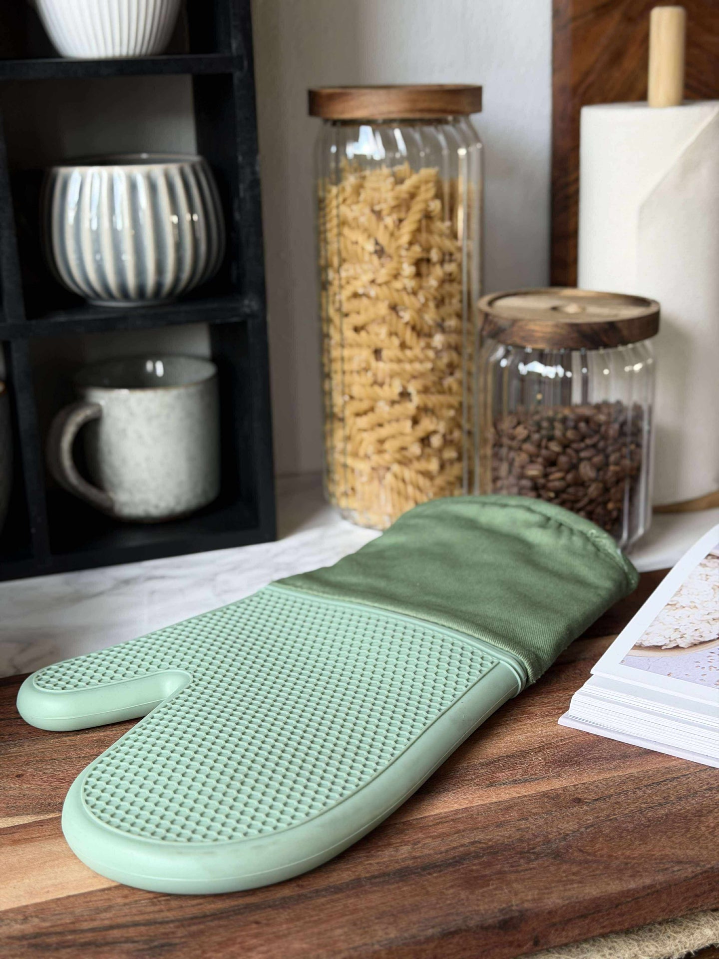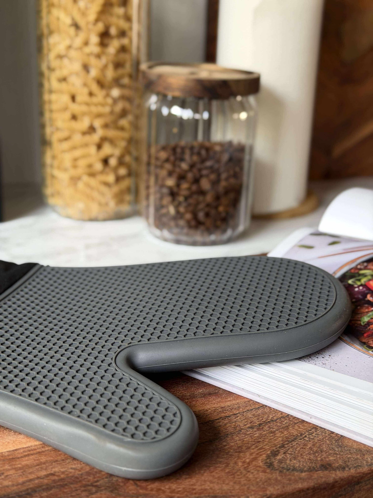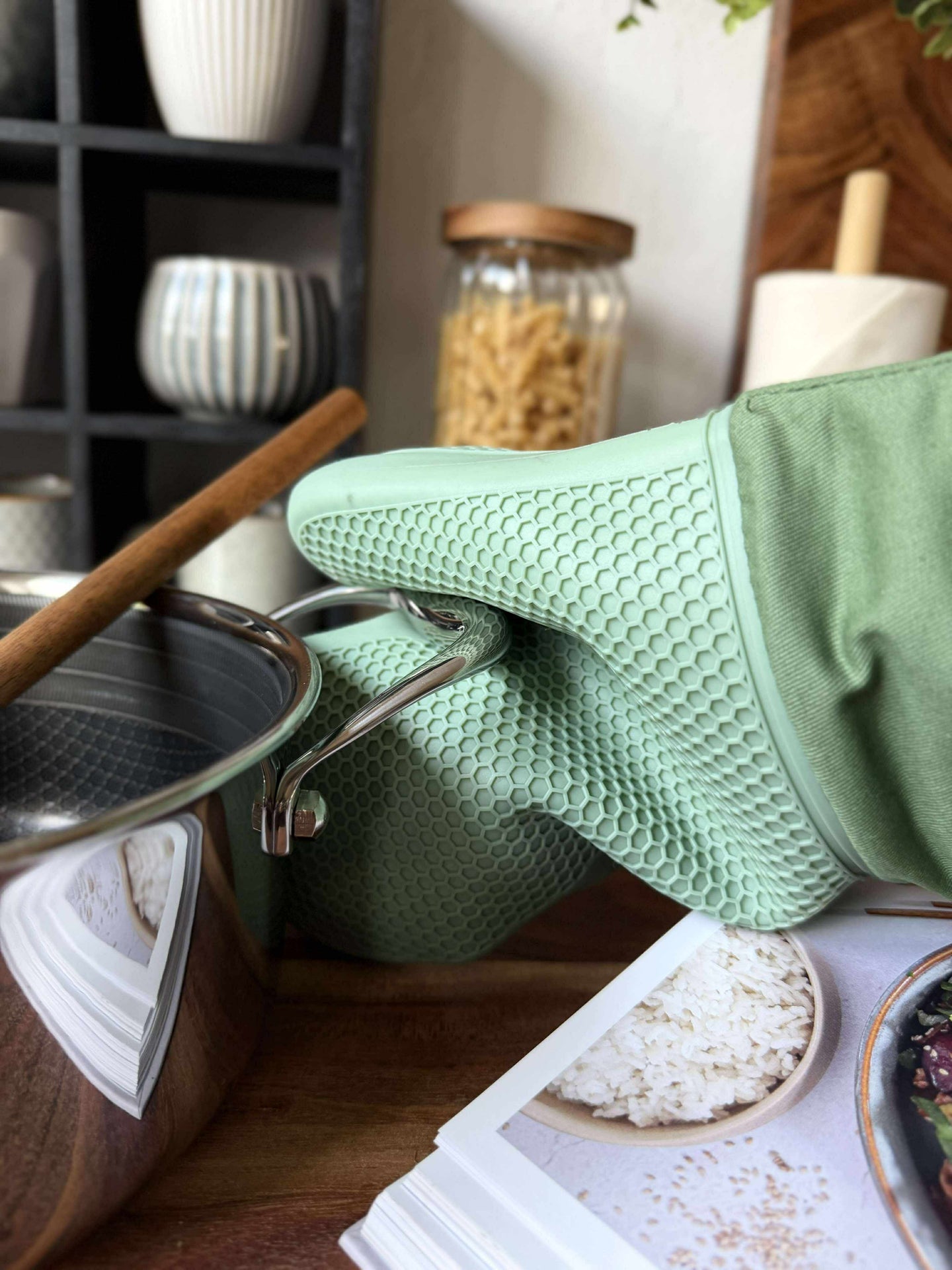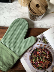 En grillhanske av kraftig kvalitet som gjør det enkelt å håndtere varme former og grilltilbehør på kjøkkenet. Hansken er grønn og kombinerer silikon med tekstil, slik at du får et funksjonelt grep med et rolig, enkelt uttrykk. Overflaten har et struktur/vevet mønster som gir godt feste.
