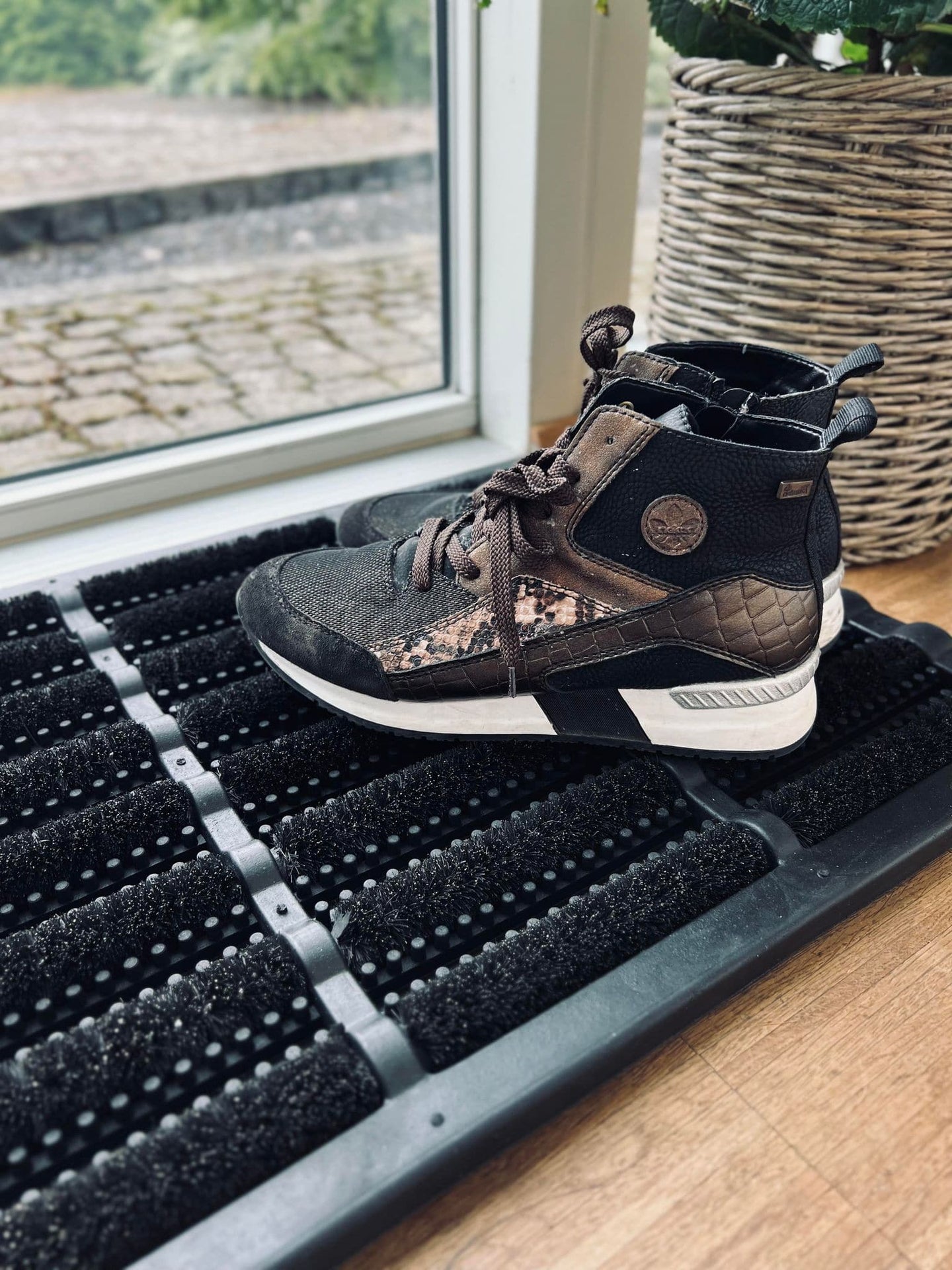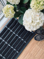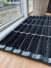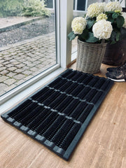 Dørmatten, laget av slitesterk svart gummi med børste, gir en effektiv løsning for å holde inngangspartiet rent. Kombinasjonen av gummi og børste fjerner effektivt skitt og smuss fra skosålene, noe som bidrar til å redusere mengden avfall som kommer inn i hjemmet. Gummimaterialet gir også en sklisikker overflate, som øker sikkerheten ved inngangspartiet.