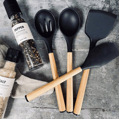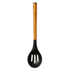 Hulsleiv med bambushåndtak og svart silikon kombinerer naturlig estetikk med funksjonell design. Bambushåndtaket gir et behagelig grep som er både lett og slitesterkt, mens det svarte silikonmaterialet sikrer skånsom behandling av kjøkkenutstyr og overflater. Dette gjør hulsleiven velegnet til daglig bruk, samtidig som den tilfører et moderne preg til kjøkkenet.