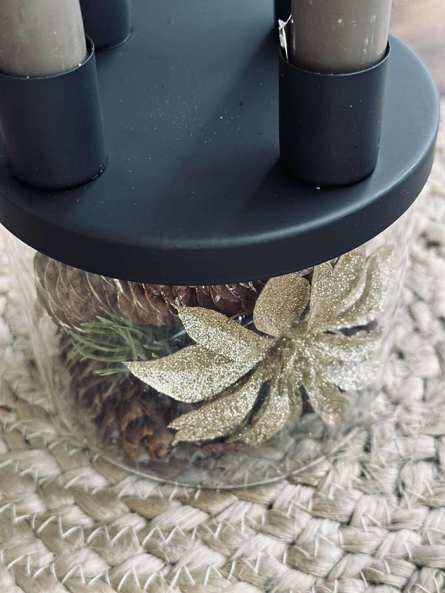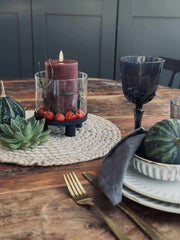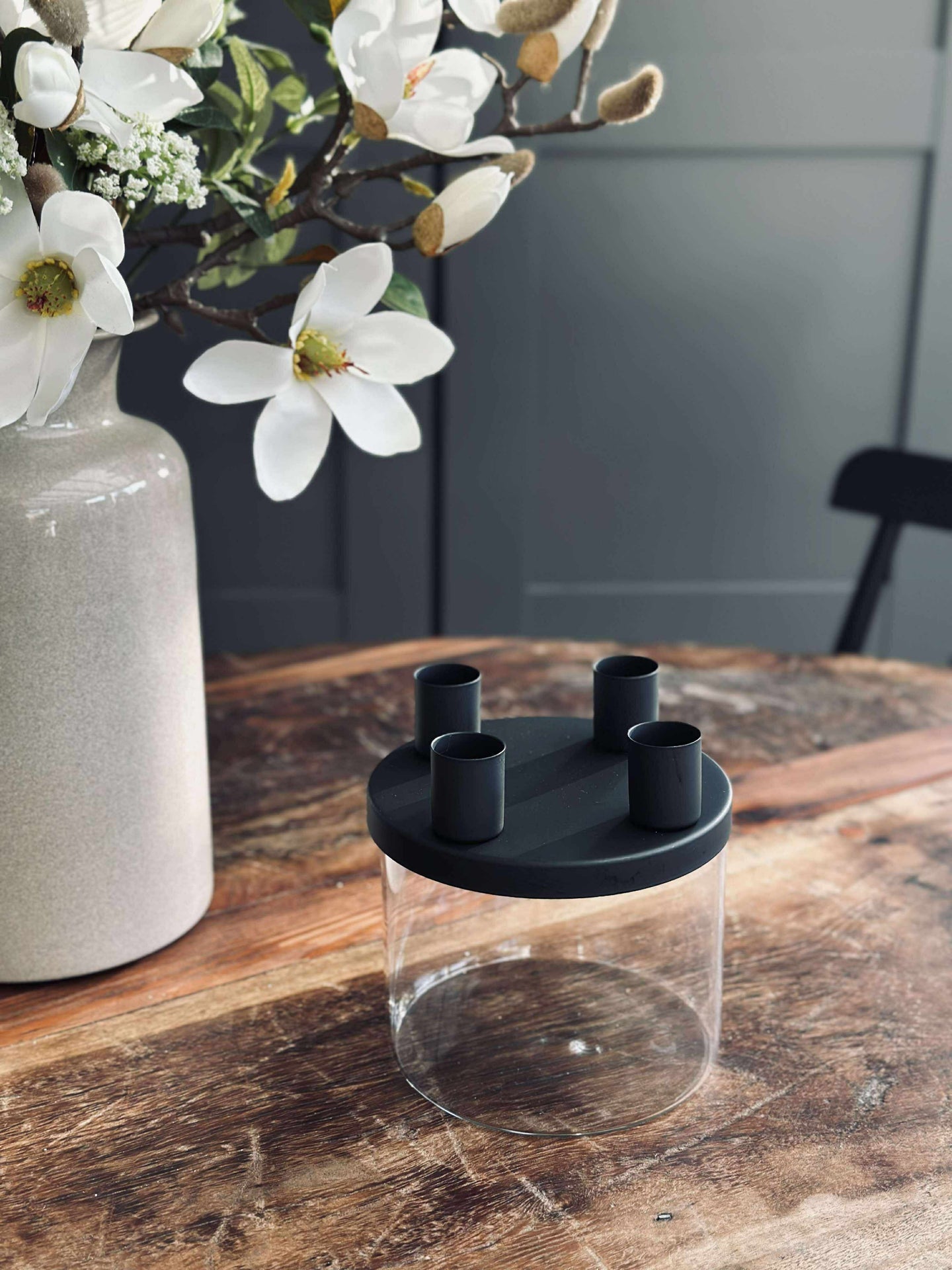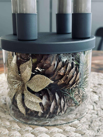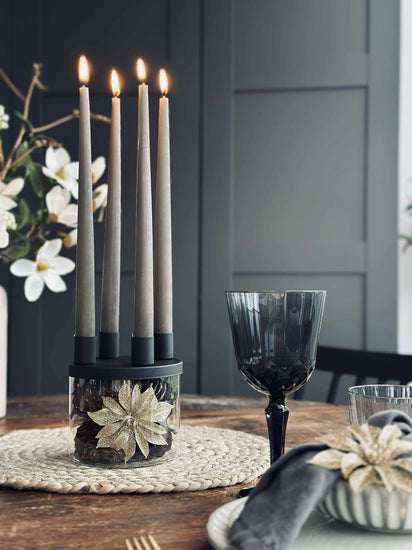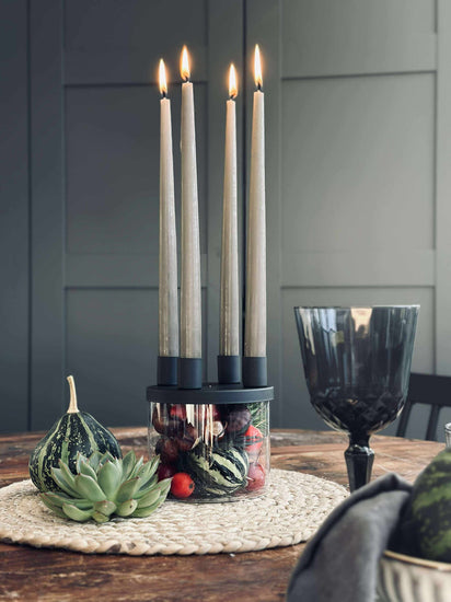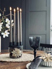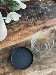 Lysestaken er utført i glass og holdt i svart for et rent og minimalistisk look. Det klare glasset gir et lett og transparent uttrykk, mens den svarte fargen samler helheten og gjør den enkel å kombinere med både lyse og mørke nyanser.
