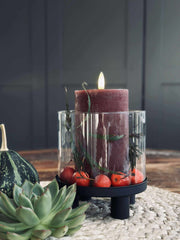 Hurricane med glass er en svart hurricane-lysestake i glass med et enkelt, ensfarget uttrykk og en tydelig sylinderformet silhuett. Den kompakte størrelsen gjør den enkel å plassere, når du ønsker en rolig detalj i innredningen. Lysestaken har 2 funksjoner, så du kan variere uttrykket i dekorasjonen din.