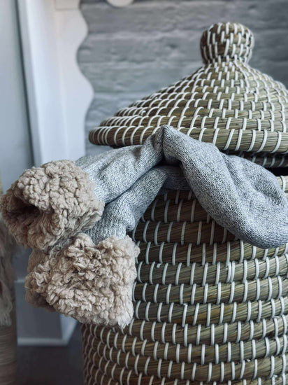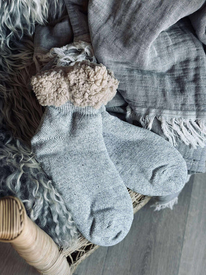 Strømpene har et enkelt, ensfarget uttrykk i grått, som passer godt inn i en rolig, nordisk stil.