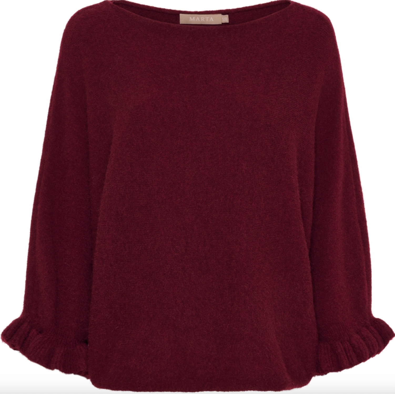 Strikk Elder flower - Bordeaux er en elegant og tidløs strikk fra Marta du Château i en rød, ensfarget utgave. Den oversized passformen gir et avslappet uttrykk, som fungerer like godt til hverdag og mer pyntede antrekk. Strikken har rund halsutringning og 3/4 ærmer, som avsluttes med en fin volangkant.