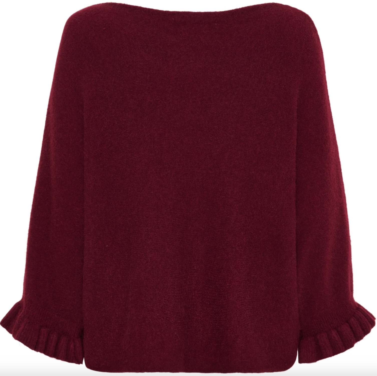 Strikken er laget i akryl og har et enkelt, ensfarget uttrykk, hvor den klare røde fargen får lov til å stå i fokus. Volangkanten på ermene tilfører en lett og feminin detalj, som gir strikken karakter uten å virke tung.