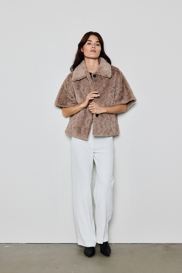 Jakke NOTZY Taupe er en trendy faux fur jakke med korte ermer, klassiske knapper og en elegant krage. Den myke overflaten gir et luksuriøst uttrykk, mens de korte ermene holder looken lett og moderne.