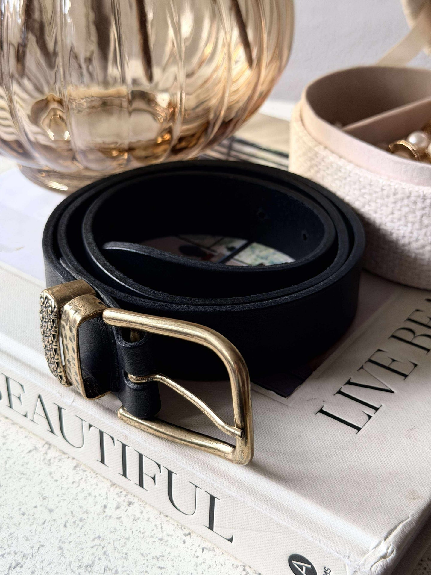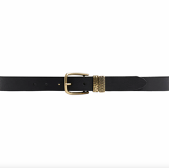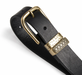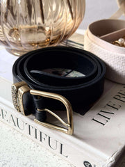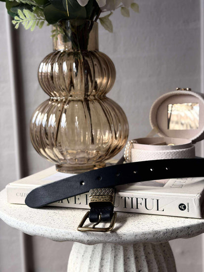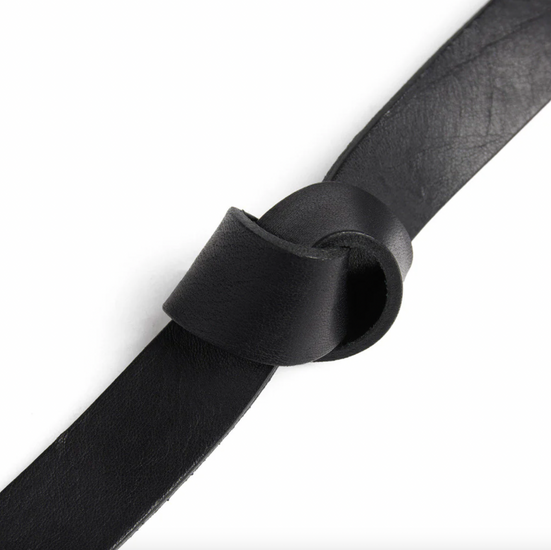 Beltet er laget i lær og har et ensfarget uttrykk i svart, som gir et rolig og tidløst uttrykk.