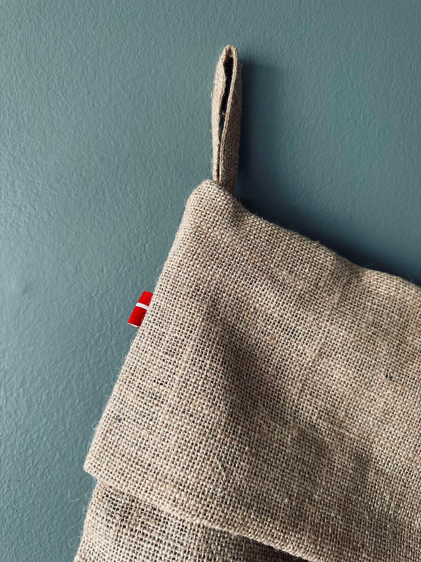 Julesokken er laget av jute, et naturlig og holdbart materiale som gir et rustikt og innbydende utseende. Dette materialet er ikke bare miljøvennlig, men også slitesterkt, noe som sikrer at sokken kan brukes år etter år. Jute gir en varm og naturlig følelse til interiøret, noe som skaper en hyggelig atmosfære i hjemmet i juletiden.