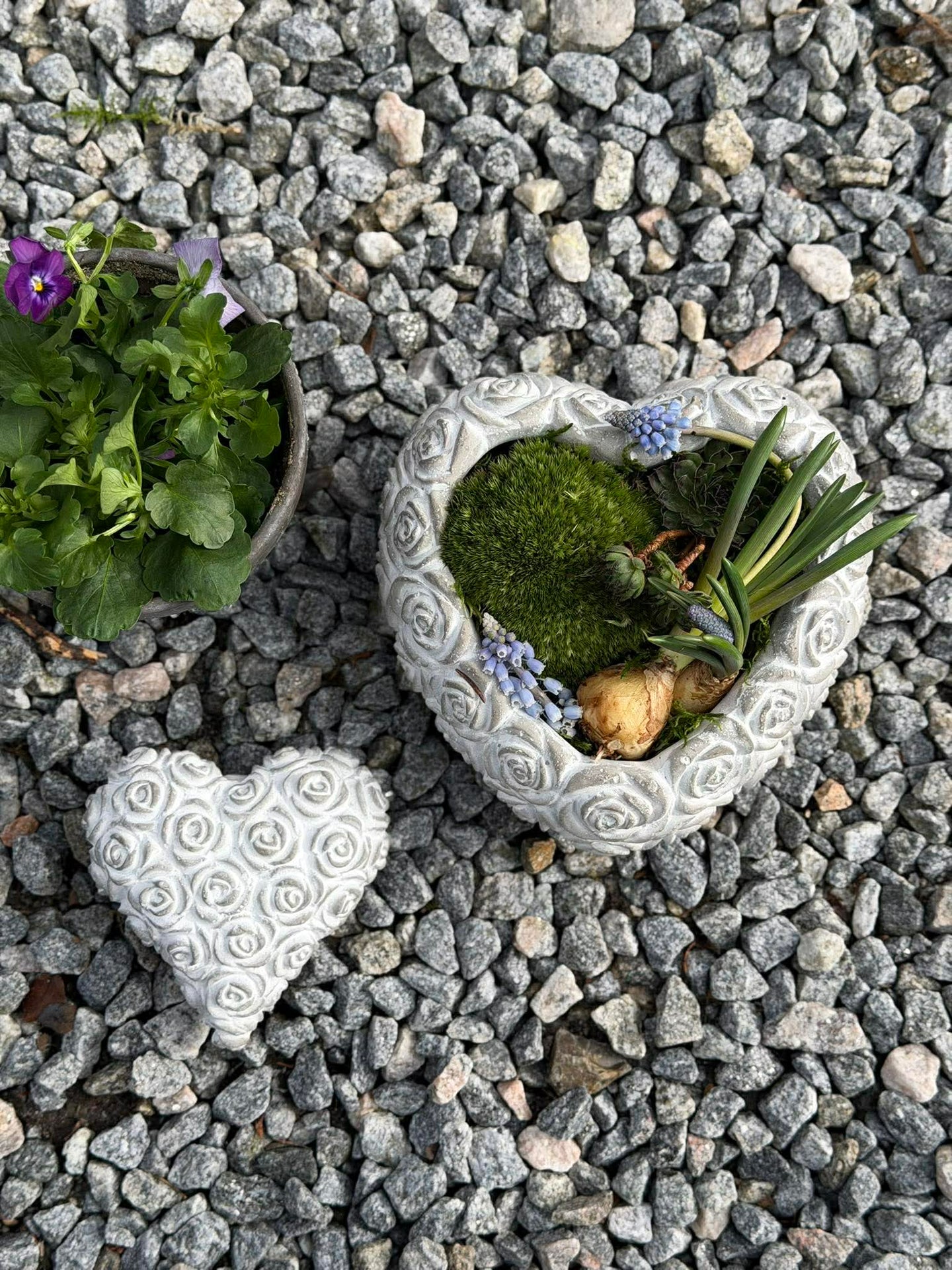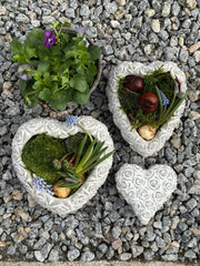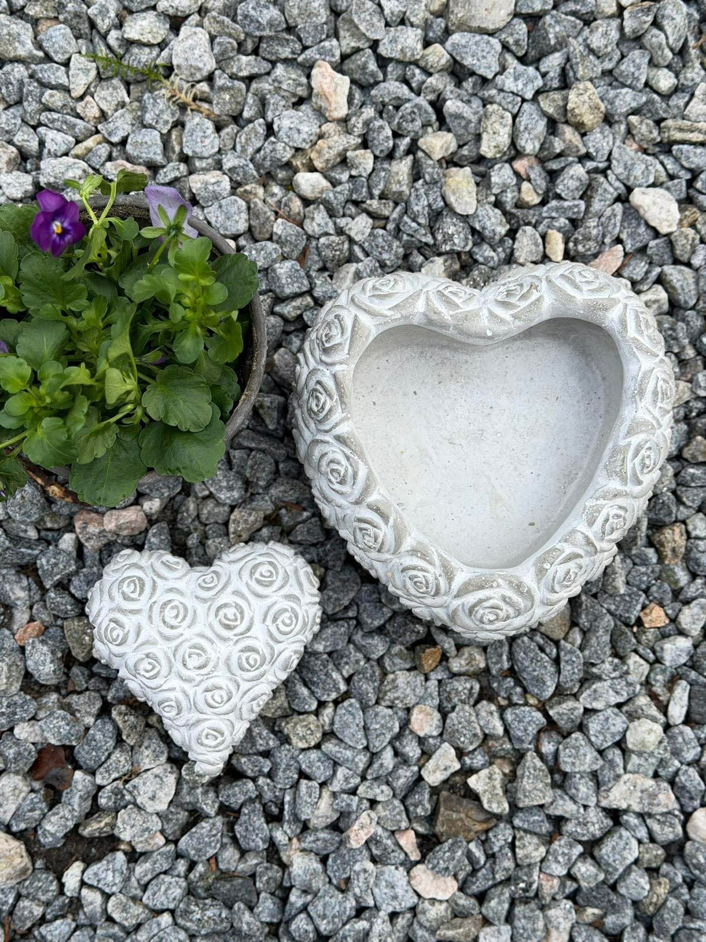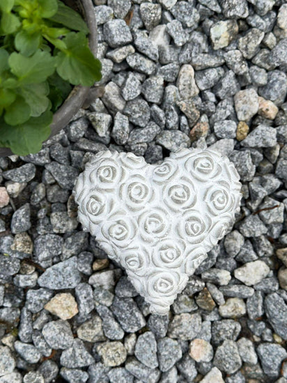 Hjerte med roser er et lite dekorativt hjerte med et rosemotiv. Det er laget i betong og har et rolig, enkelt uttrykk som gjør det lett å kombinere med andre dekorasjoner.