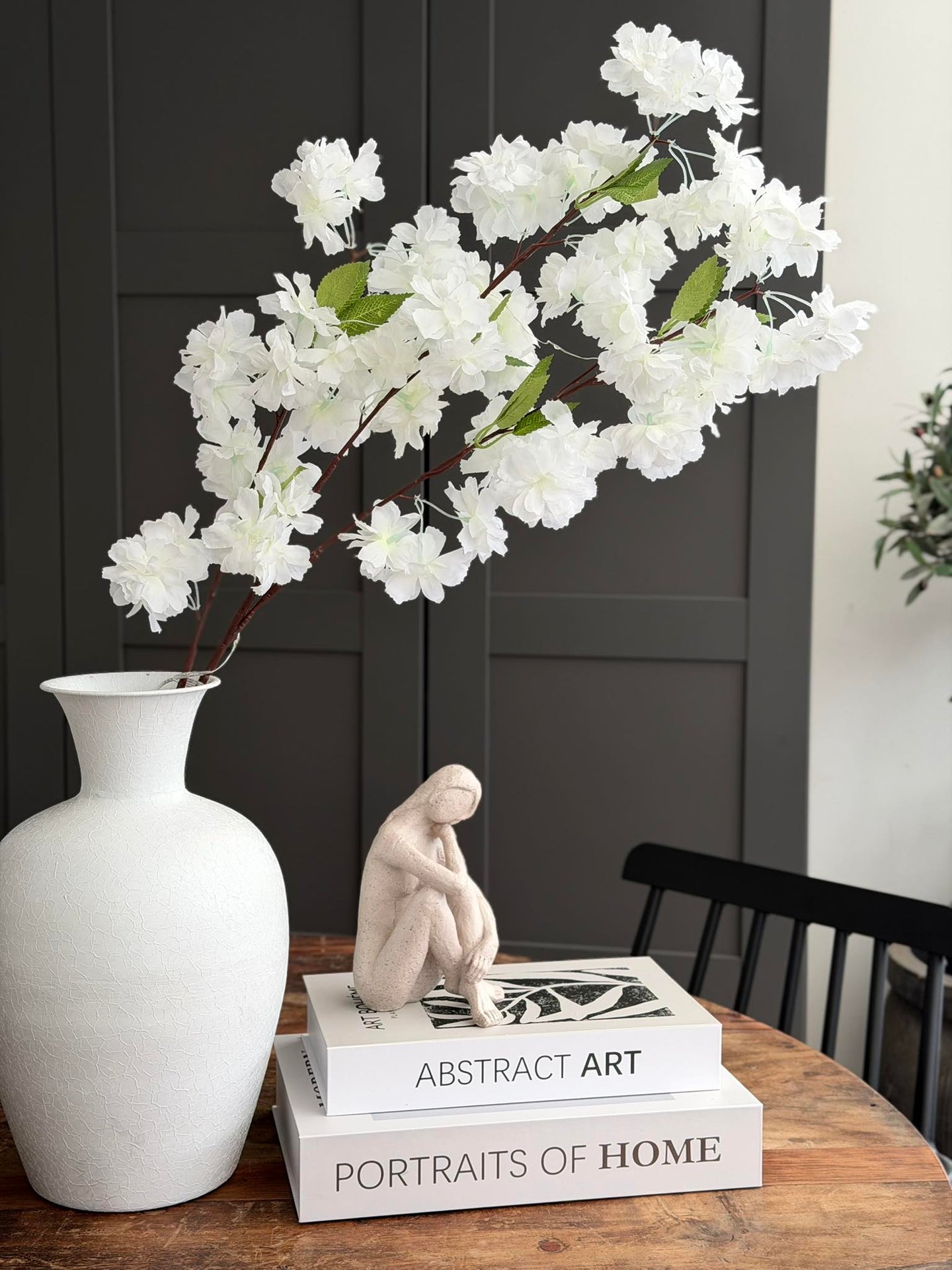 Bruk kirsebærgrenen som en dekorativ detalj i stuen eller plasser den på et konsollbord, hvor lyset kan bidra til en rolig stemning i rommet.