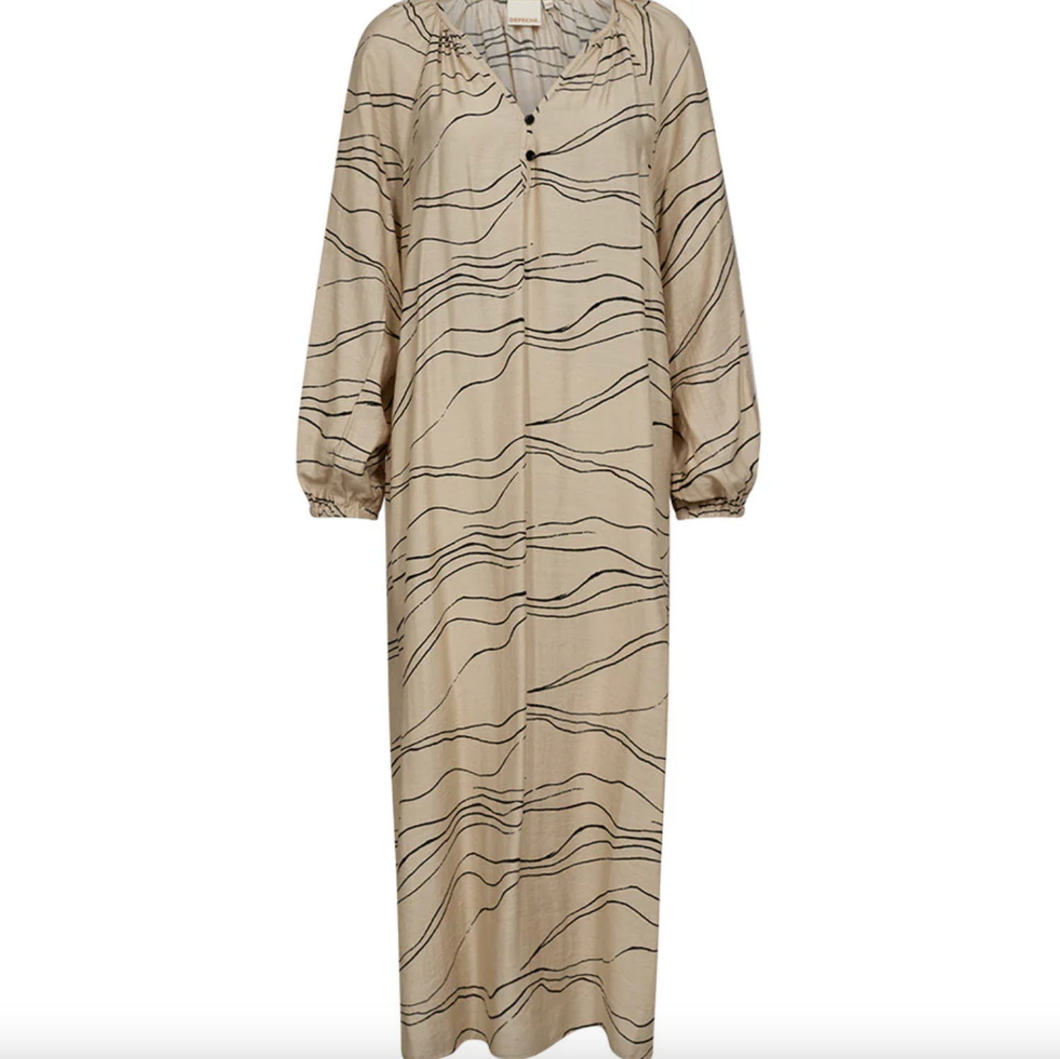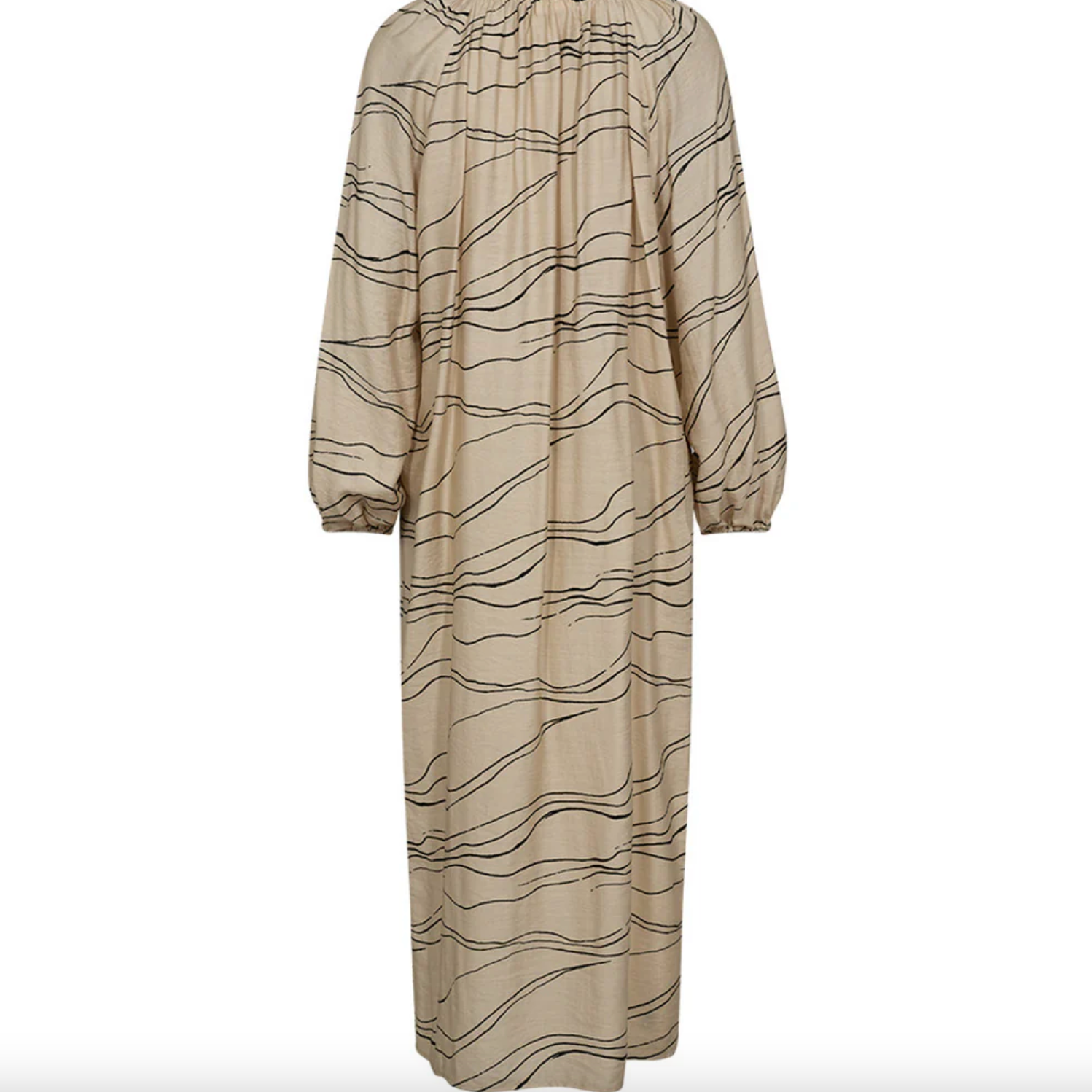 Kjole Evy - Depeche er en klassisk og tidløs Depeche-kjole som fungerer like godt til hverdagsbruk som til mer festlige anledninger. Den beige fargen og det grafiske/geometriske mønsteret gir et rolig, stilrent uttrykk med litt ekstra kant. Passformen er regular, så kjolen faller avslappet og behagelig.