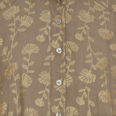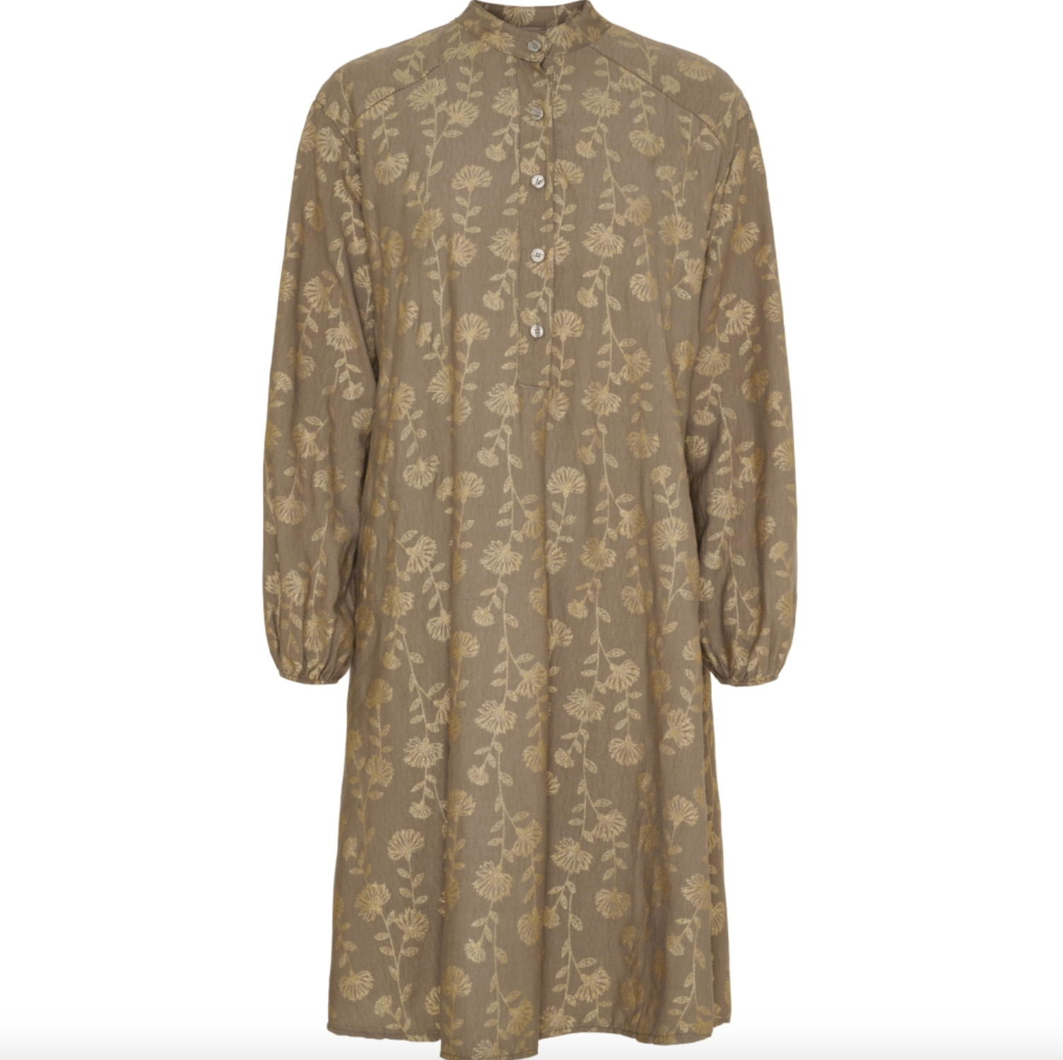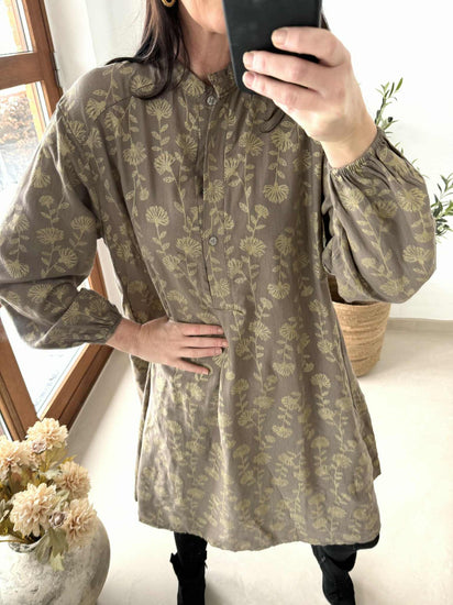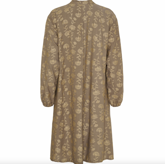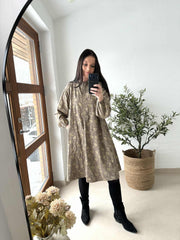 Kjole med gullprint er en brun kjole med et dekorativt print, som gir et markant og samtidig rolig uttrykk. Passformen er oversized, så den faller romslig og avslappet på kroppen. Det gjør den lett å style til både hverdagslook og mer pyntede anledninger.